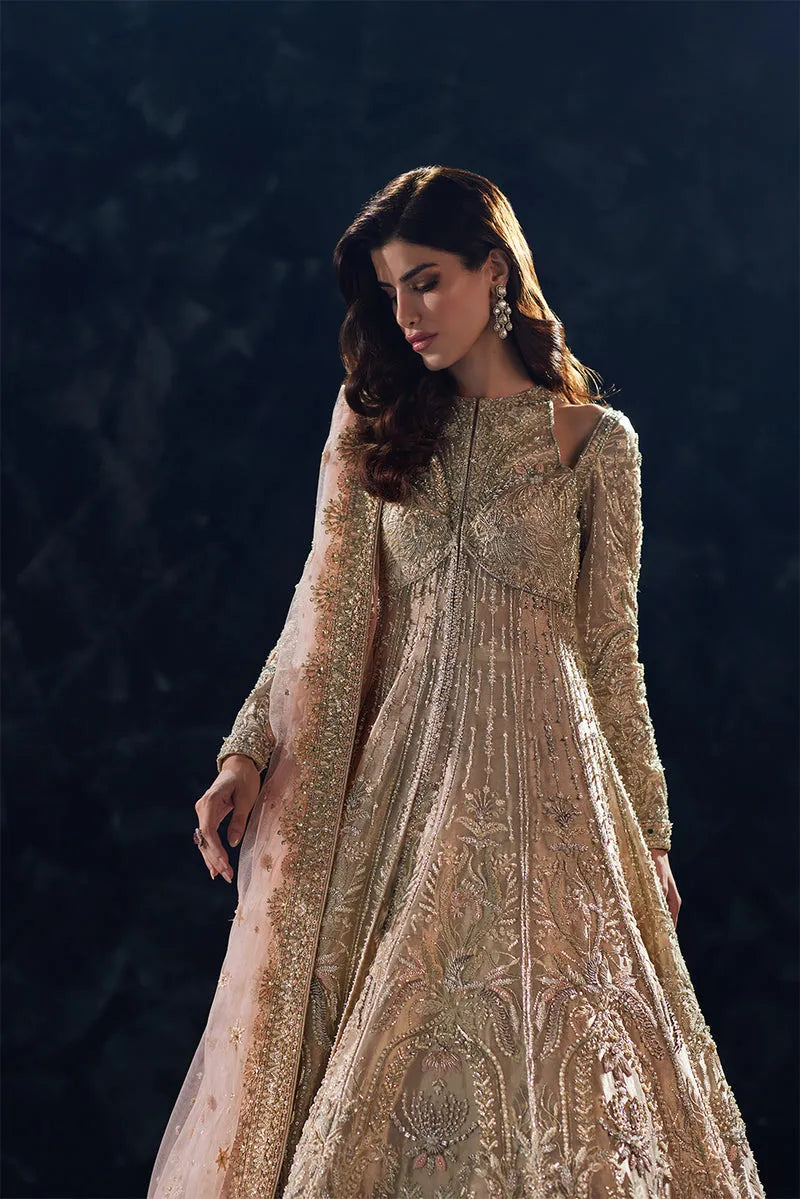 An ethereal Gold tissue masterpiece, the upper gown is intricately embellished with sheesha and dabka work, which captures the essence of timeless elegance. The luxurious 3D patch work on fabric, meticulously adorned with exquisite hand-embroidery, drapes flawlessly to create a regal silhouette paired with flowy lehnga inside. The dupatta is heavily embroidered with sequins and dabka work. This gorgeous ensemble commands attention with its graceful flow and unparalleled craftsmanship.