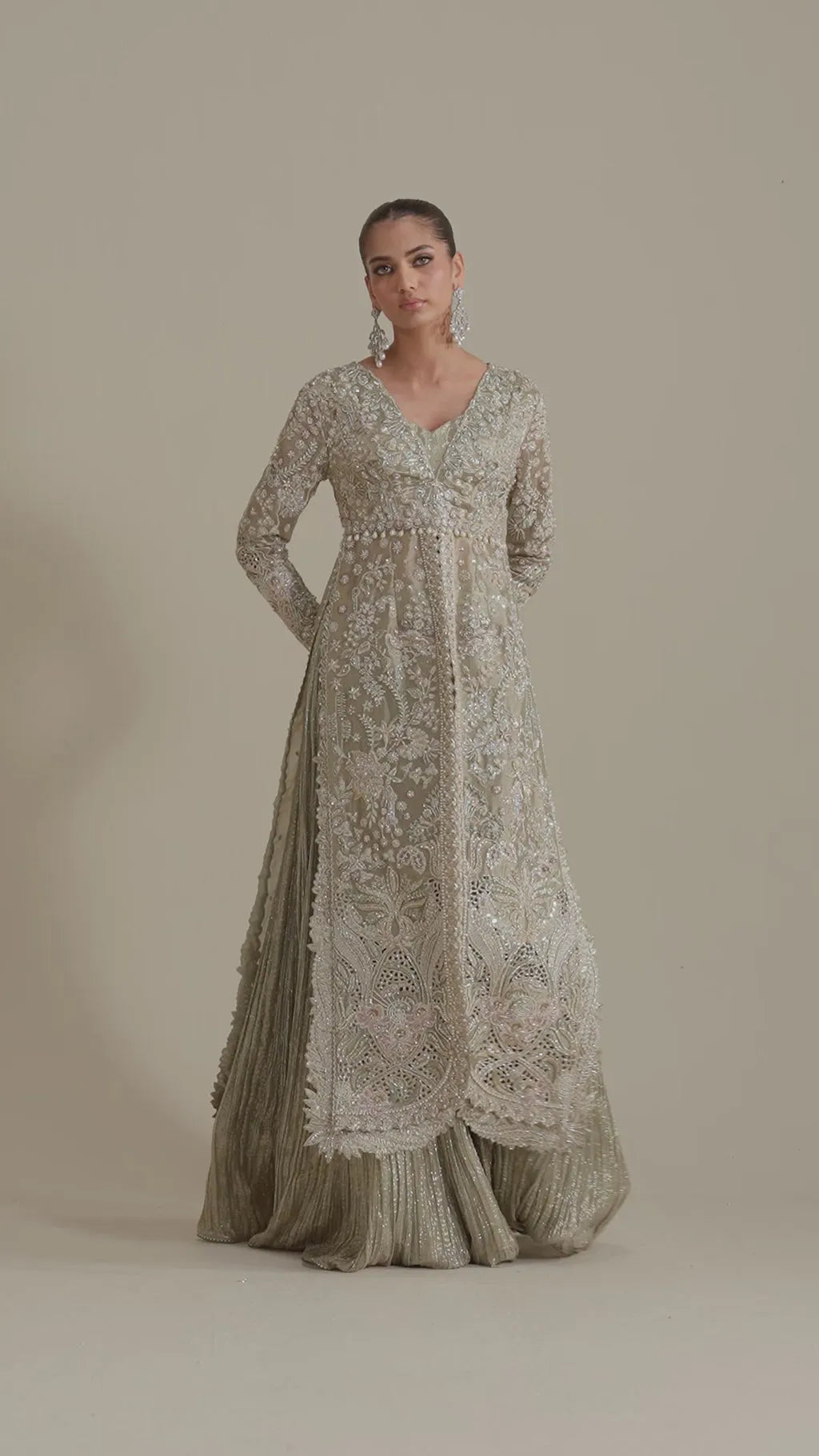 A statement ensemble crafted on premium tissue, featuring a long shirt with a graceful front slit paired with an elegant sharara. Its smoky green canvas is subtly lifted with soft hints of pink and adorned with intricate handwork that adds timeless artistry.