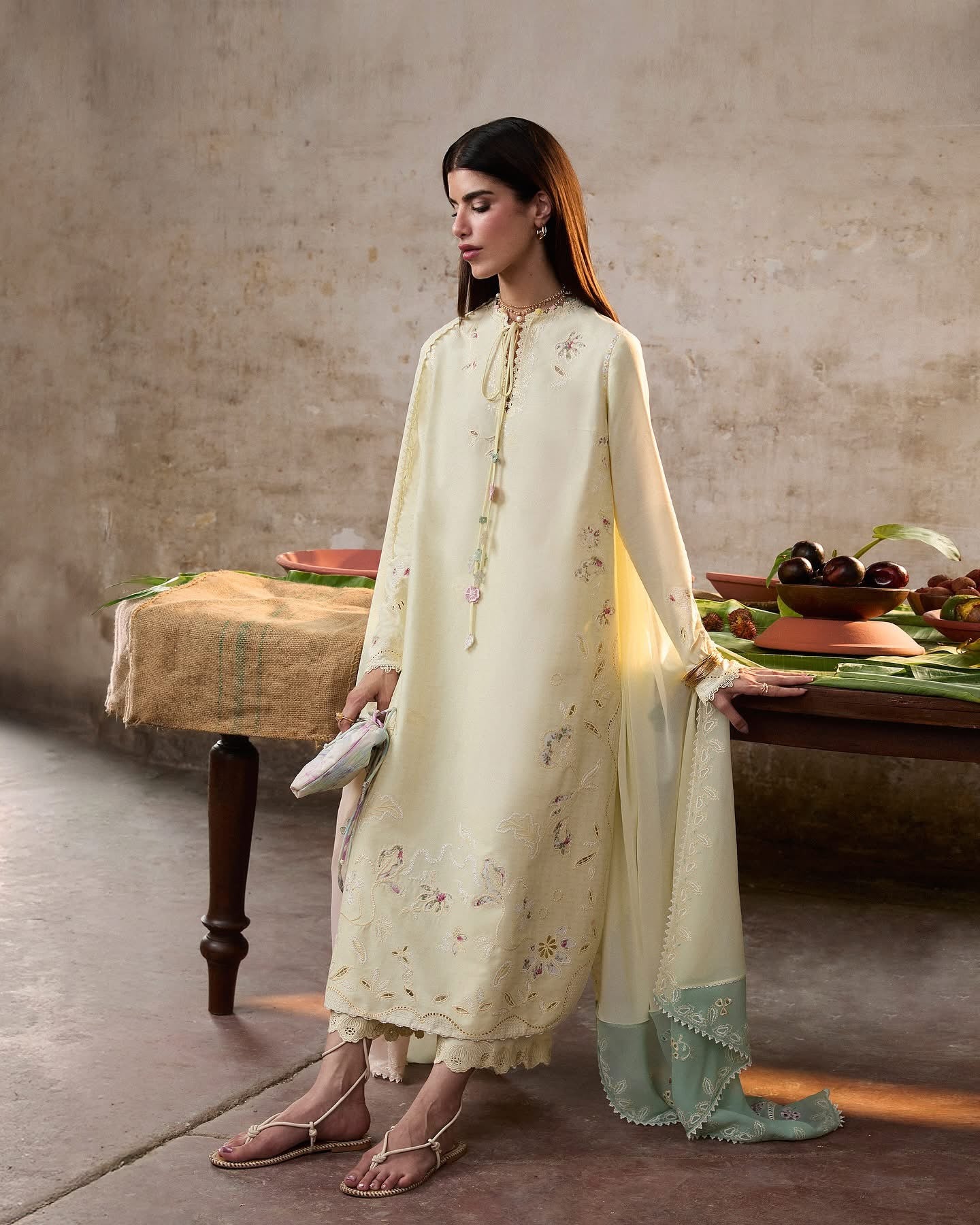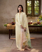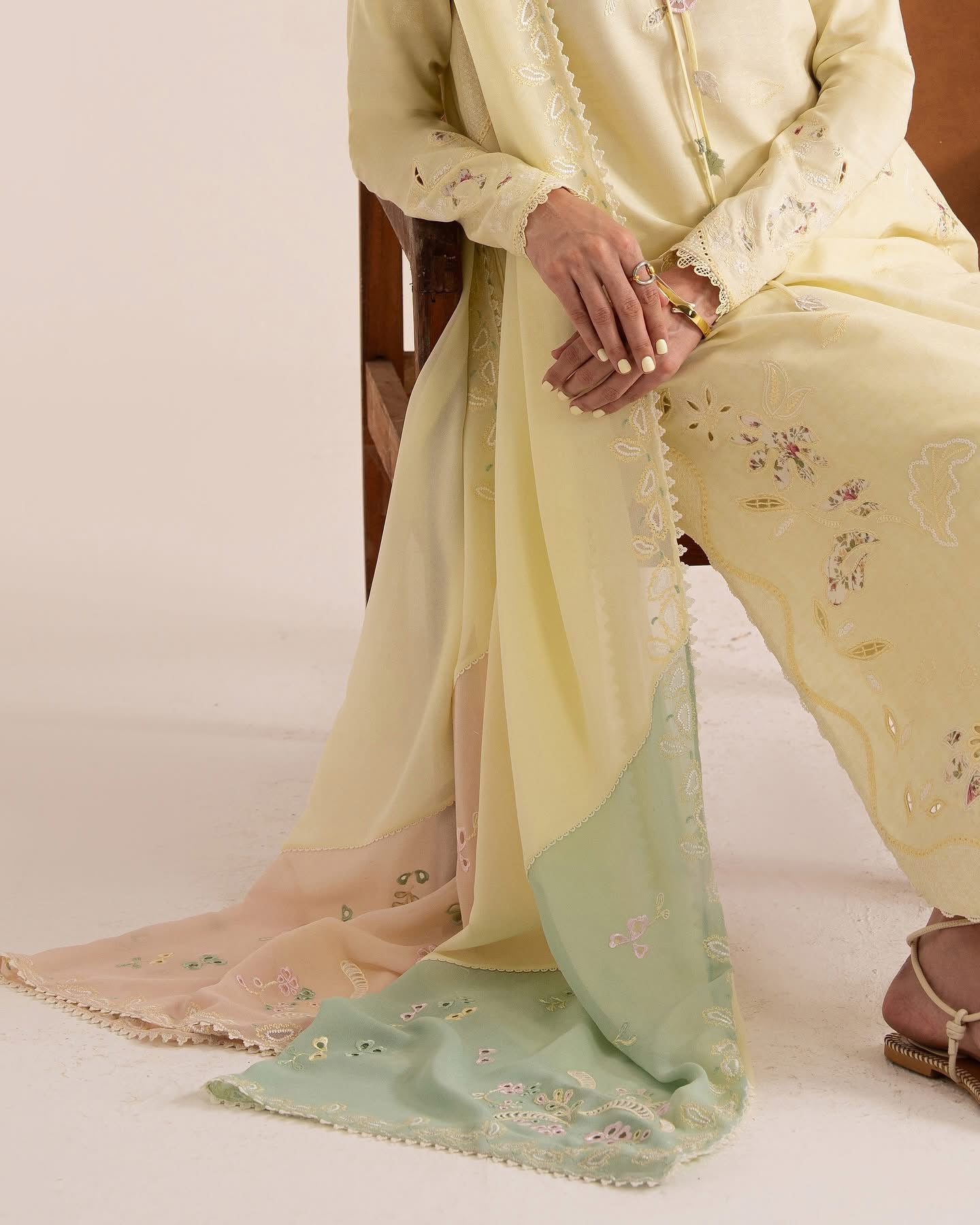 Gradient chiffon dupatta blending butter-yellow, pink, and green with embroidery accents and lace edging on all sides.