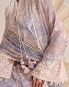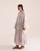 Periwinkle Peach printed lawn kaftan-style A-line shirt with raglan sleeves, 3D floral motifs, applique embroidery, and bell sleeves with chiffli and boring accents. V-neckline with hanging tassels and fringes adds movement.