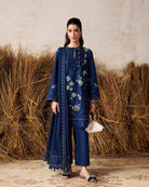 Royal Blue short jacquard lawn shirt with keyhole neckline and stitched accents. Features applique floral embroidery in green and pink, patchwork on hem and sleeves, and tassels around the neckline.