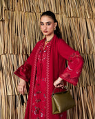 Ruby red straight jacquard lawn shirt with V-neckline and hanging threaded tassels. Appliqué-style embroidery in bold contrasting tones with geometric patchwork on hem and corners. Sleeves end in organza panels with lace and boring detail.