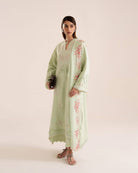 Mint Green drop-corner jacquard lawn shirt with a slight V neckline. Features geometric floral embroidery with curtain-like tassels, floral boring on hem, and bell sleeves with winding stitch details for contrast.