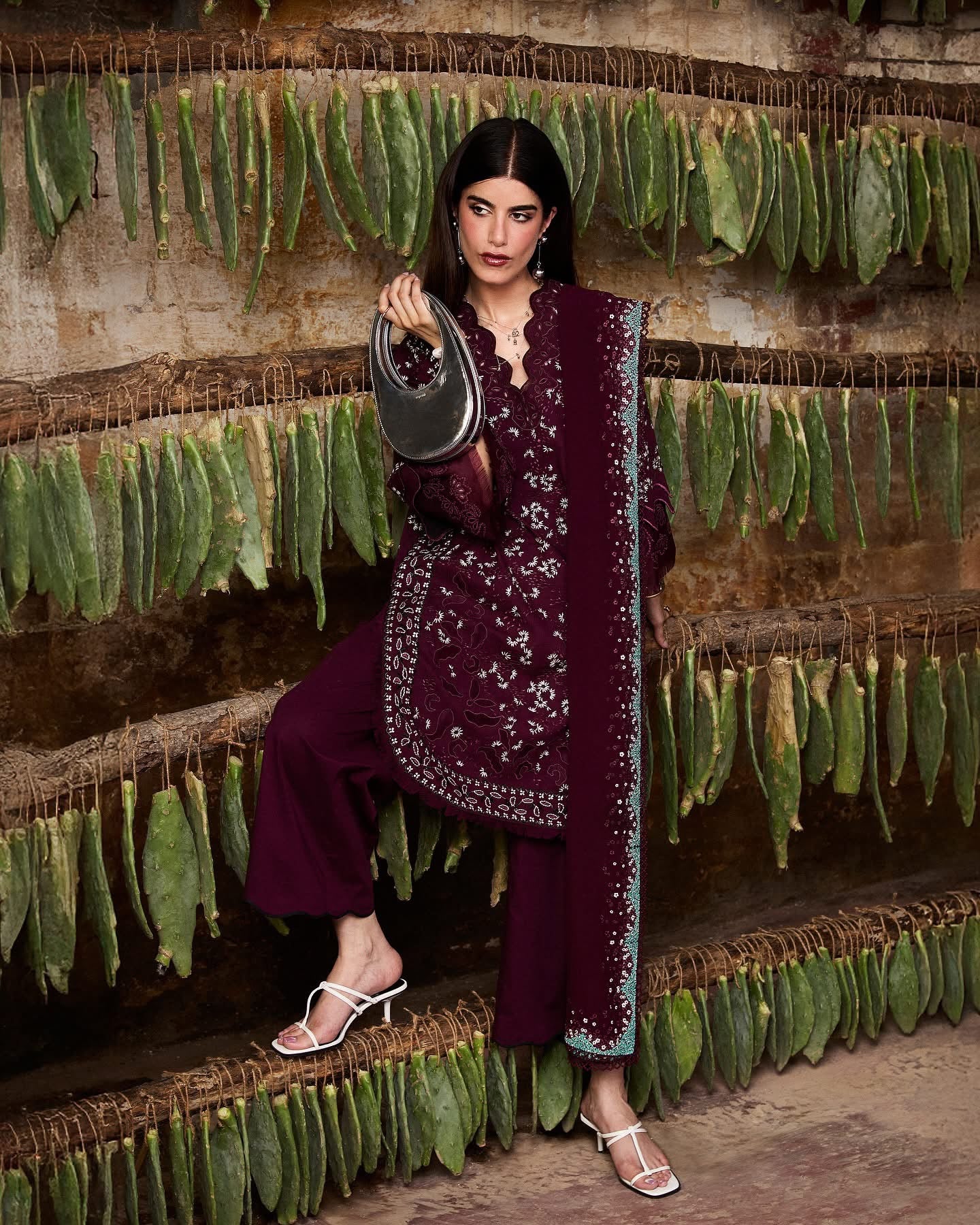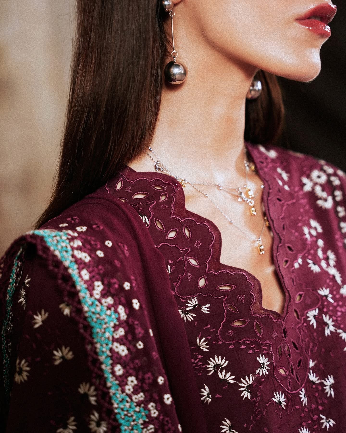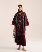 Wine jacquard short shirt with scalloped V neckline and all-over white petal embroidery. Hem and sleeves finished with cutwork organza and fringes, creating a textured, dimensional look.