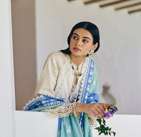 A contrasting chiffon duppata in ice blue, with a double tone design. It features embroidered borders on all four sides and an all-over spray effect. Lace details in white enhance its appearance, and it is finished with tassels.