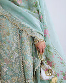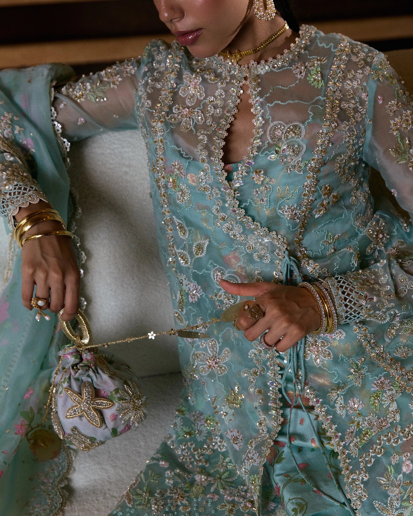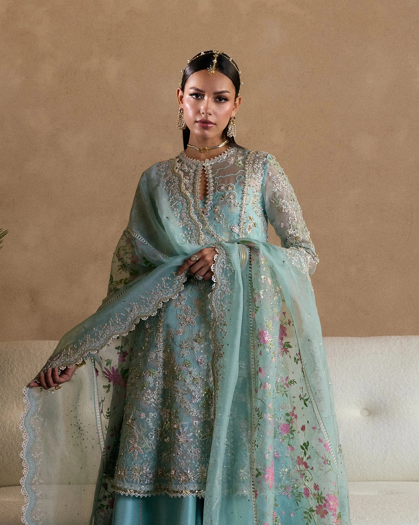In serene aquamarine, this four-piece look exudes refined elegance. The organza paneled angharaka peplum features a keyhole neckline with tassels, lace accents, and sequin edging over a floral print silk slip. Paired with raw silk paneled sharara pants and a matching organza dupatta with scalloped borders, screen print, and tasselled paan patta motifs, the ensemble is a vision of grace.