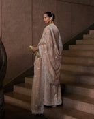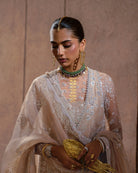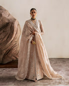 Luxury in nude beige, this four-piece design defines modern elegance. The raw silk front - open shirt features a plunging halter neckline with organza fitted sleeves straight undershirt embroidered with white and silver motifs. Styled with a silk slip , bell-cut silk pants, and an organza dupatta finished with sequins, layered borders, and tassels, the ensemble is sophisticated and refined.