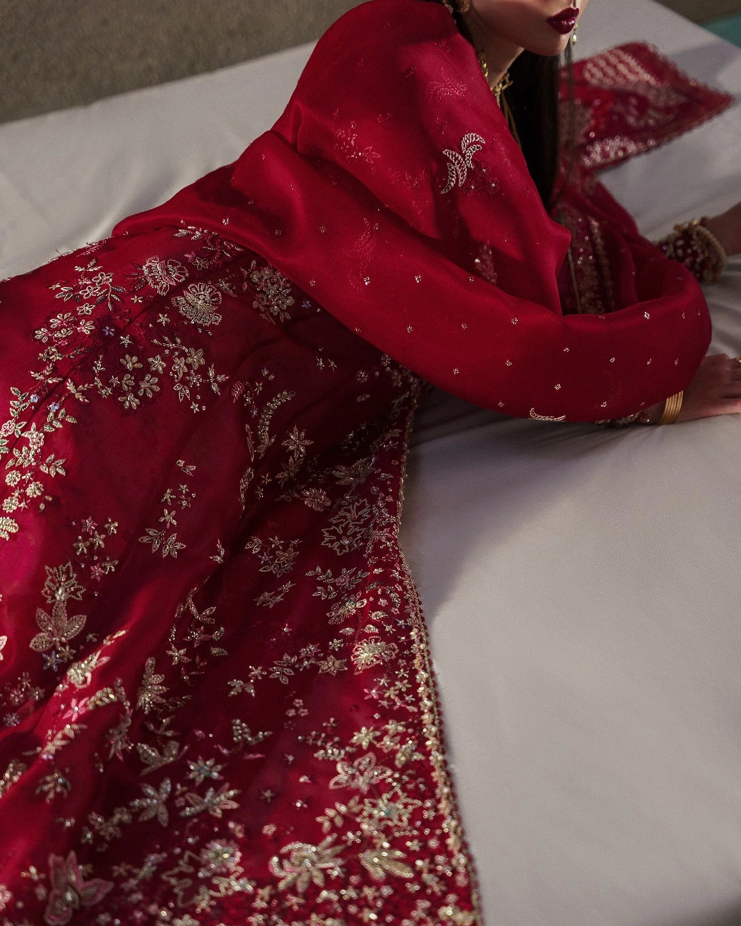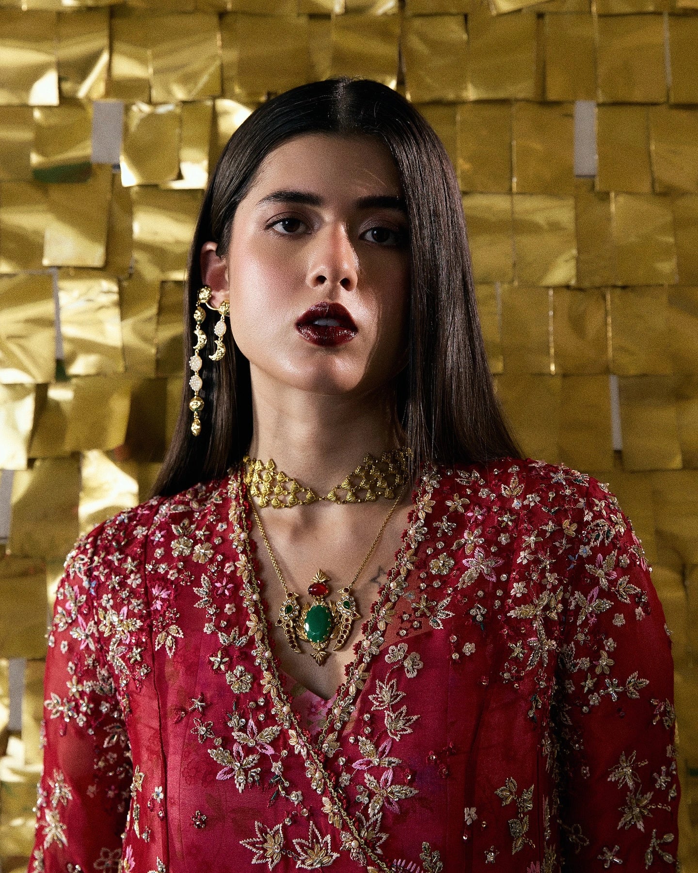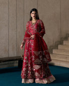 A rich wine-red ensemble featuring an angrakha-style front-open organza shirt with an overlapping V-neckline. Embroidered in pink, green, and gold, the shirt is accented with intricate lace on the hem and sleeves, finished with a front tassel, layered over a printed pink raw silk slip. Soft pink raw silk sharara pants feature scalloped sequin borders for a glamorous touch. The organza dupatta echoes the opulence with four-sided sequin patti and a heavily embroidered pallu adorned with chaand bali motifs and lace finishes.