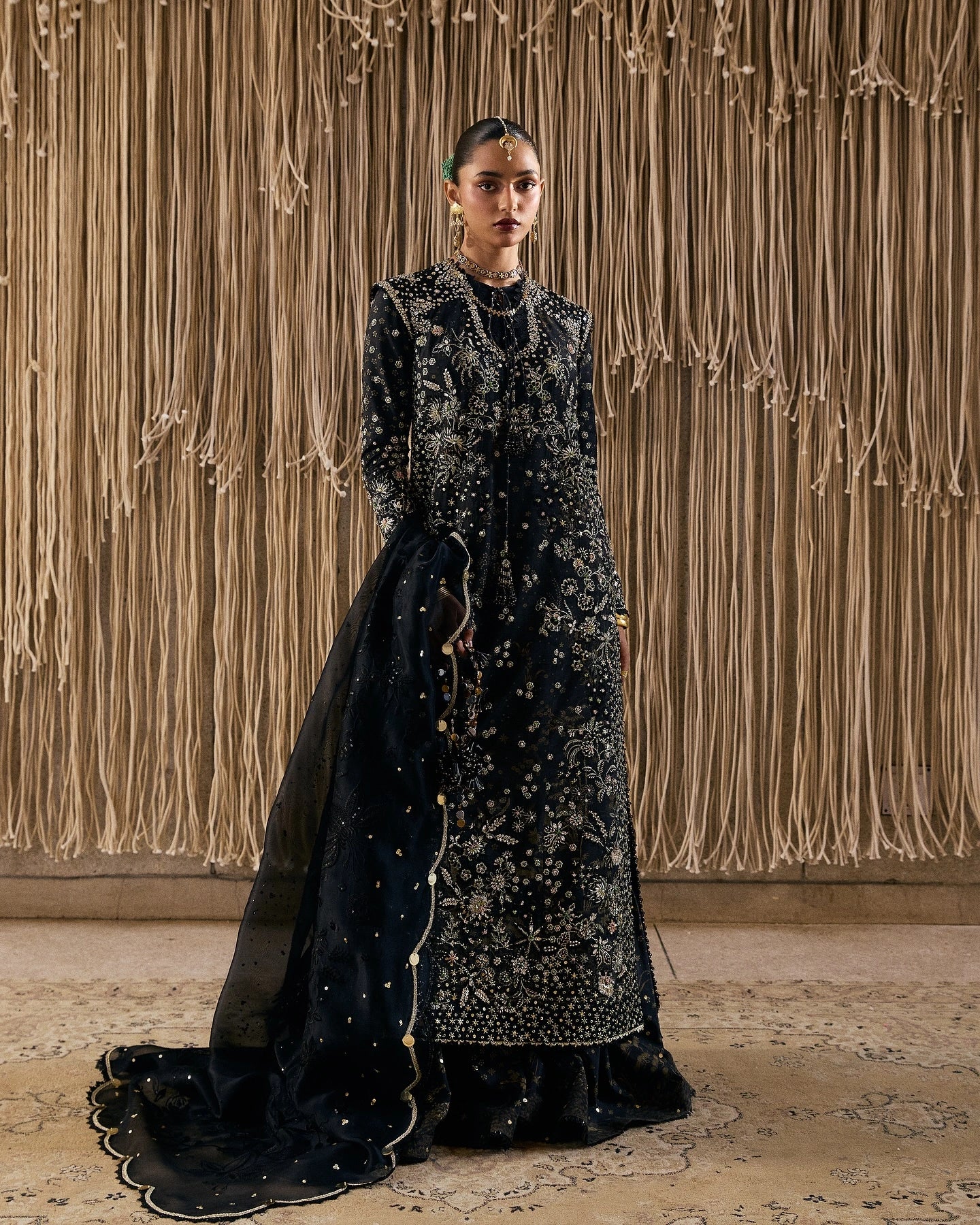 In deep coal black, this three-piece set features a raw silk printed straight shirt with embroidered detailing around the crew neckline and organza patching. Accented with lace extending to fitted sleeves that widen at the shoulders for a capped look, finished with gold tassels. Paired with matching raw silk gharara pants detailed with low lace and gold sequin spray. The organza dupatta completes the look with a scalloped border and gold sequin coin tassels.
