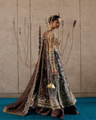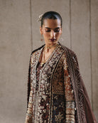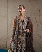 Drenched in deep brown tones, this four-piece set features a printed organza front-open multi-paneled, in grays and yellows that gradiate the brown, shirt with a square neckline. Embellished with golden sequins and hints of green, red, and white, the paneled design is finished with intricate laces, contrasting grey accents, and tassels. Styled with a printed grip silk slip and matching sharara pants with scalloped edges. The organza dupatta is adorned with self and gold embroidery, sequins, and a printed four-sided border with sequin tassels.