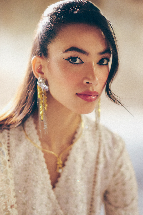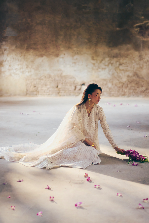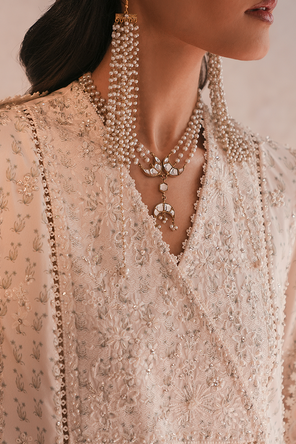 • Porcelain White Silk Panelled Anghrakha style shirt, printed grip base with colours in hints of green and pink to contrast the porcelain. The shirt is further enhanced in same-tone, white embellishments and embroidery. Fitted sleeves and lacework finish the look.