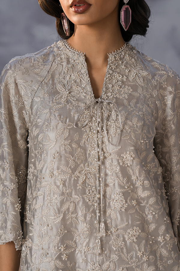 - Silk Silver Tissue silk crew necked floor length shirt with raglan balloon sleeves. It has over all embroidery and spray embellishments enhance the look. Front and neck tassels and pearl and swaroski work on neck and sleeve. Comes with a slip.