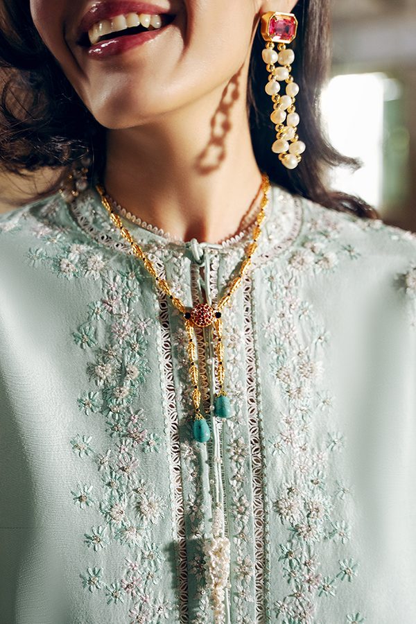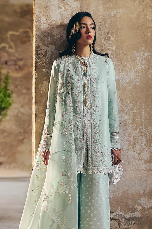 • Tiffany Blue Silk, front open short shirt with crew neckline with tassels. There are lace fills at the neck and embellishments further extend the look into the shirt. There is lace at the hem meeting the cenere bordered work. The sleeves are fitted netted extensions.