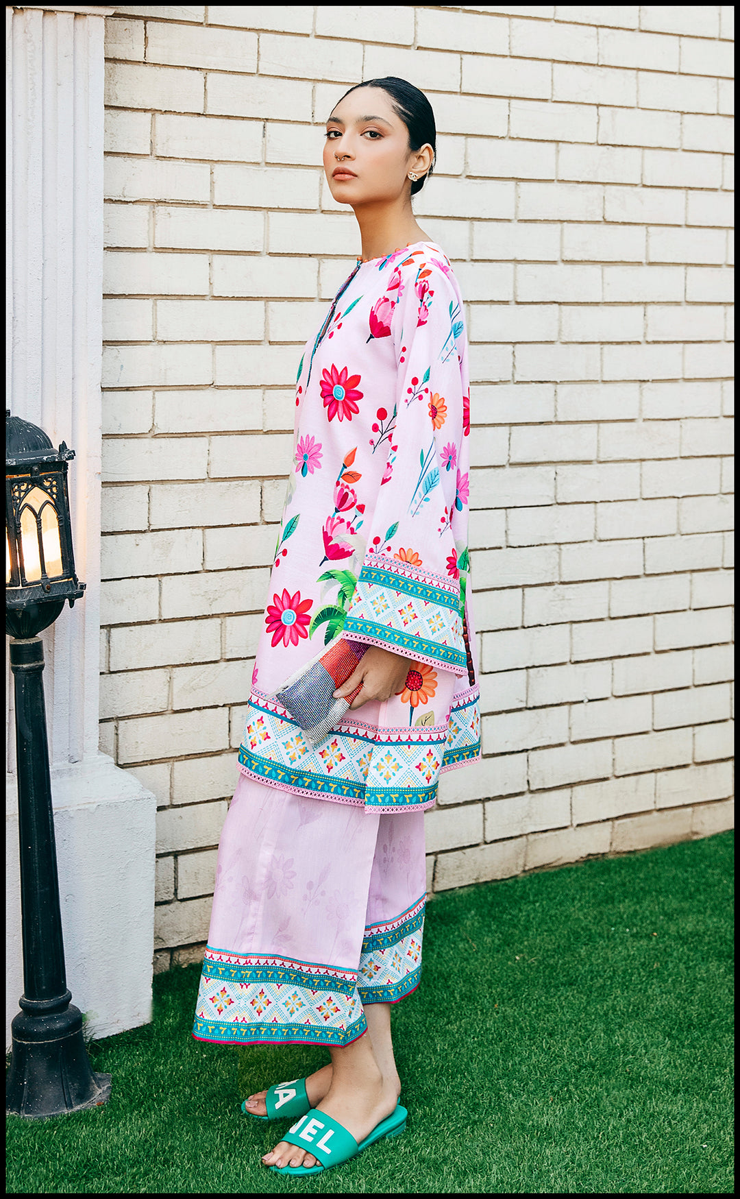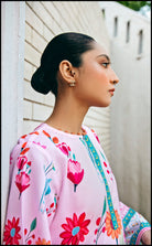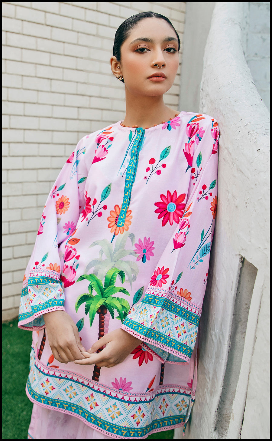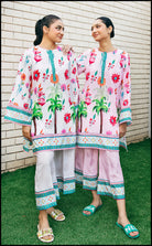 This fresh pink co ord set features a straight cut shirt and loose trousers with tropical floral details with prominent palm trees and aqua hued border details along the neckline and hem, welcoming the arrival of happy sunshines this season.