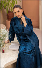 Immerse yourself in the elegance of Teal Temptation — a three-piece embroidered velvet ensemble that blends regal charm with contemporary grace. The shirt is exquisitely detailed with intricate tonal embroidery, accentuating the neckline, sleeves, and hem with finesse. Paired with matching trousers and a delicately embellished dupatta featuring ornate borders, this ensemble captures the essence of winter luxury.