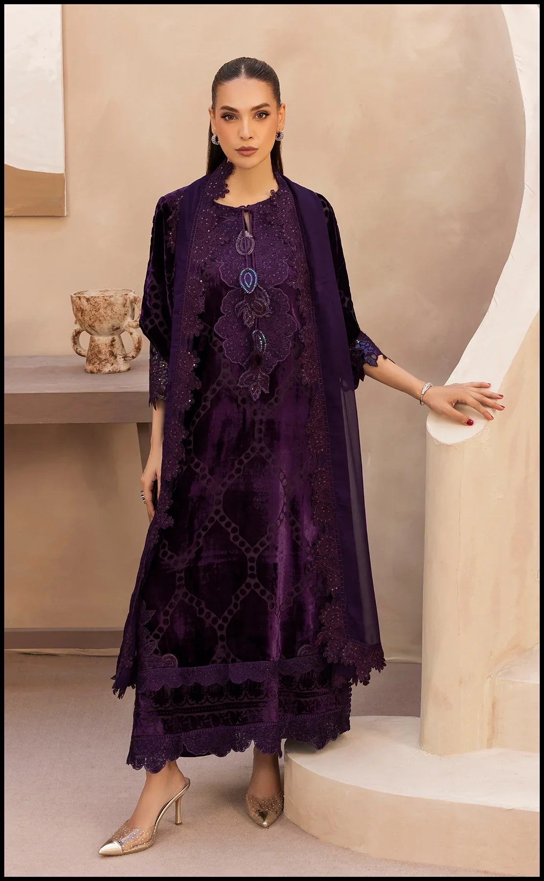 A celebration of elegance and finesse, Twilight Charm is a 3-piece velvet ensemble that embodies regal sophistication. The deep plum hue is elevated by an exquisitely embroidered neckline, adorned with intricate handwork and shimmering accents that add a refined sparkle. The delicate lace detailing and graceful dupatta complete the look, creating a harmonious blend of luxury and allure — perfect for evening occasions where timeless