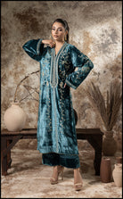 This luxurious teal velvet co-ord is adorned with intricate gold and silver threadwork, showcasing a delicate floral and geometric design. The ensemble features a flowing, full-sleeve kurta with a gracefully embellished neckline, bordered with intricate embroidery, complemented by matching straight-cut trousers. Perfect for formal events and festive occasions, the rich fabric and elegant craftsmanship make it a timeless choice.