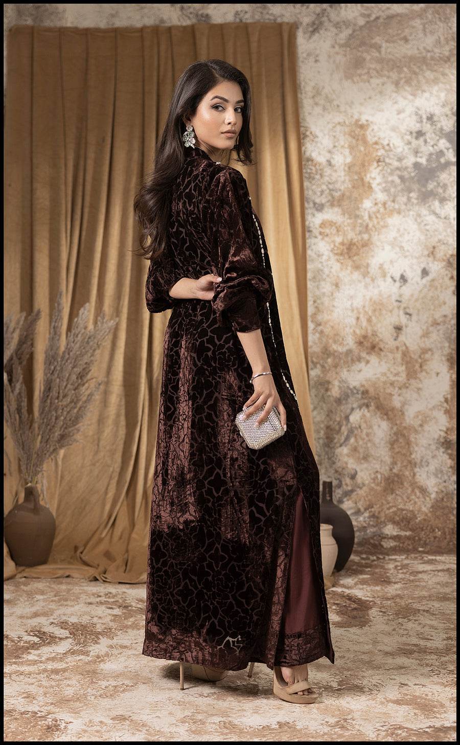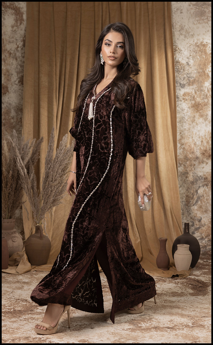 This luxurious velvet co-ord set in a rich emerald green shade features a unique, abstract velvet texture that adds depth to its design. The highlight of the ensemble is the intricate Swarovski embellishment on the neckline, forming a dazzling floral-inspired motif with a subtle keyhole detail for a statement look. The flowy silhouette and long sleeves enhance its graceful appeal, making it an ideal choice for formal events or evening gatherings. Pair it with sparkling accessories for an effortlessly glamorous appearance.
