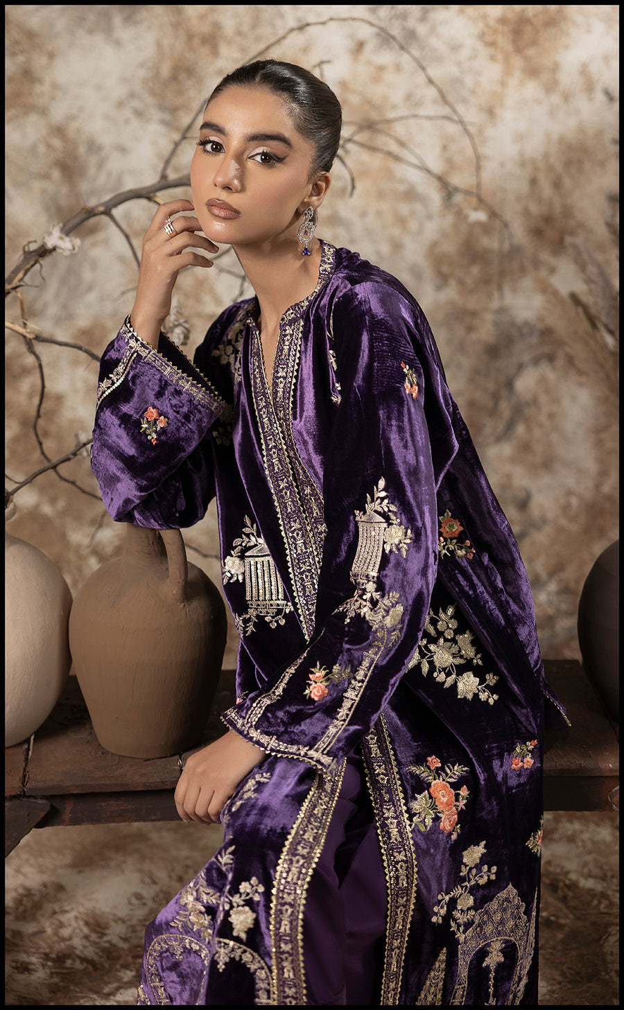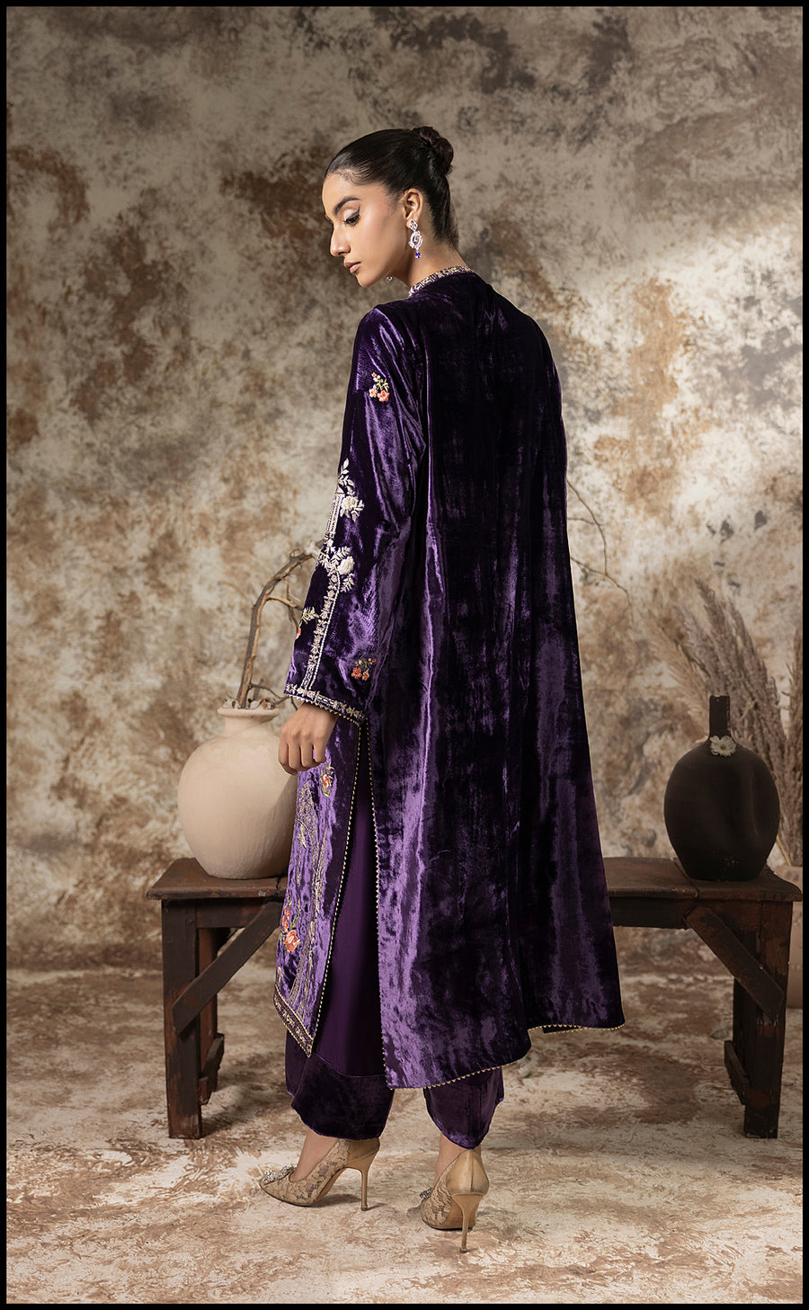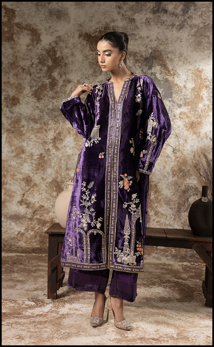 This luxurious deep purple velvet outfit is a masterpiece of elegance. Adorned with intricate floral and architectural embroidery in gold and pastel hues, it exudes a regal charm. The long, flowing silhouette features full sleeves and a V-neckline, offering a blend of sophistication and tradition. Paired with tailored trousers, this ensemble is perfect for winter soirées and festive occasions, making a striking statement with its bold, opulent color.