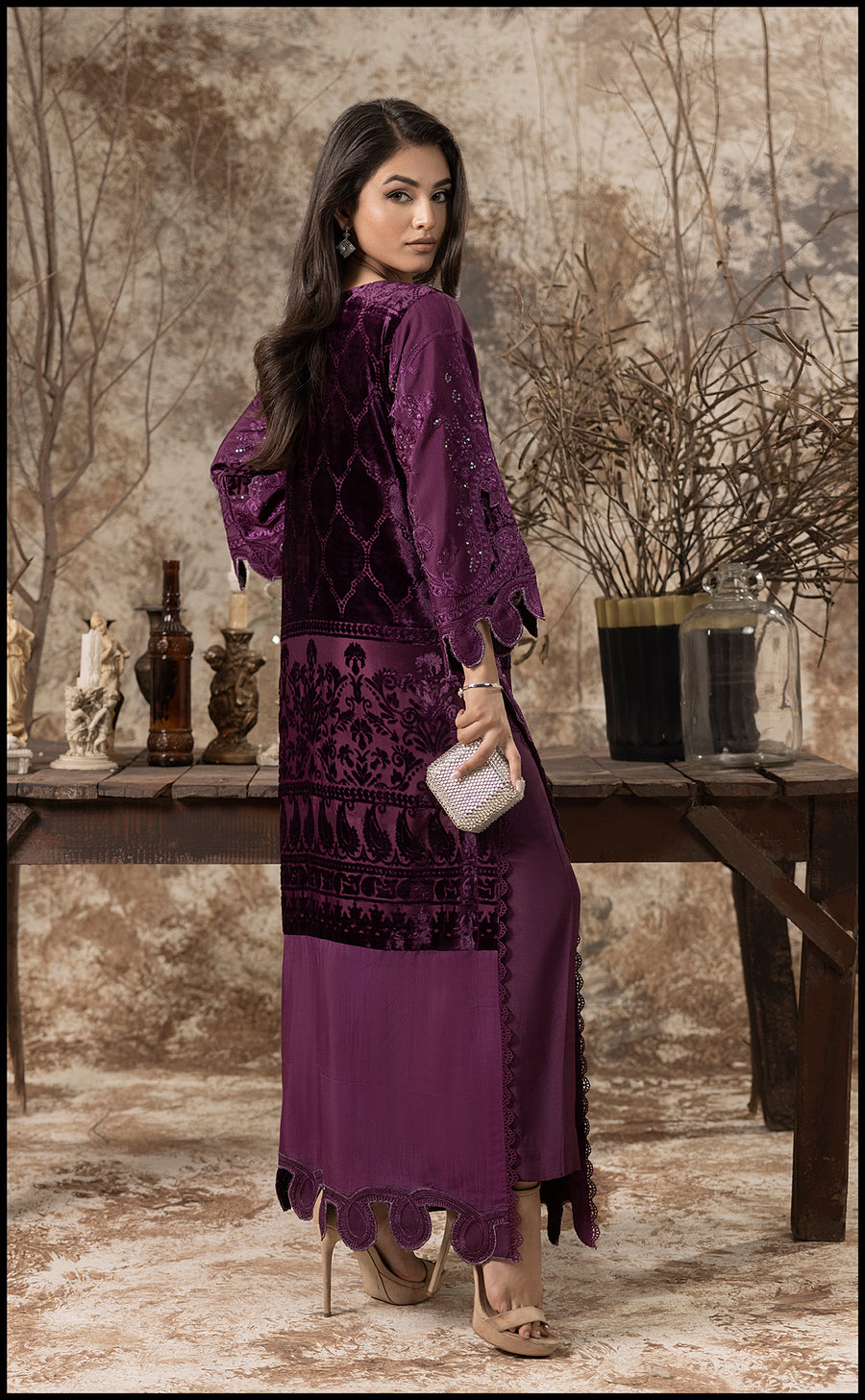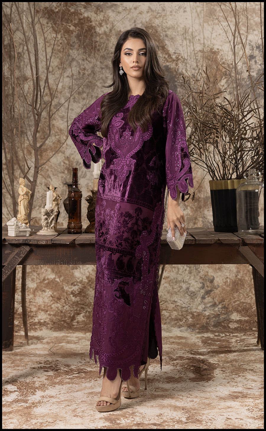 Step into regal sophistication with this deep plum velvet ensemble, a true masterpiece of elegance. Intricately adorned with baroque-inspired motifs, the rich texture and intricate cutwork detailing along the hemline and sleeves add a luxurious touch. The flowing silhouette flatters effortlessly, while the bold hue evokes timeless grandeur. Perfect for evening gatherings, weddings, or festive celebrations, this outfit seamlessly combines opulence with grace, ensuring you stand out as the epitome of refined charm.