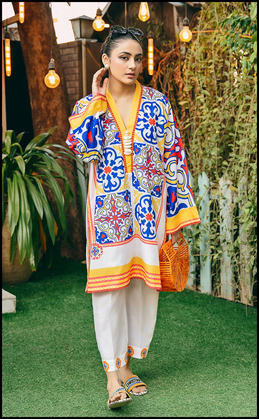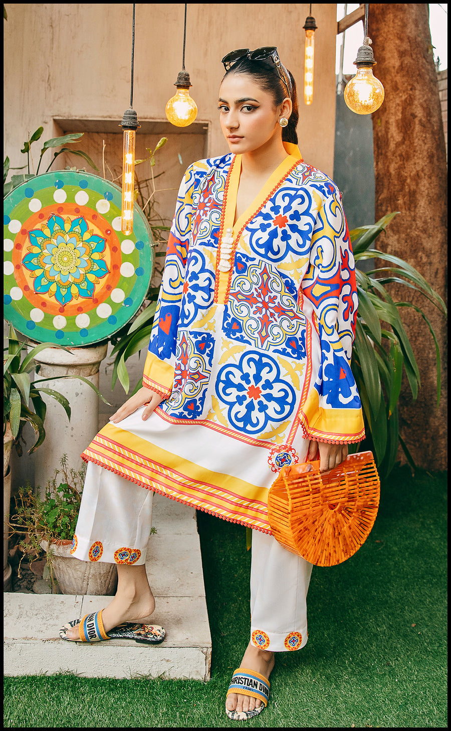 This oh so amazing pink fusion is your summer go to print co ord set. The neck line and sleeves are adorned with cute fan shaped threaded pieces. Paired with loose trousers with beautifully patterned border details.