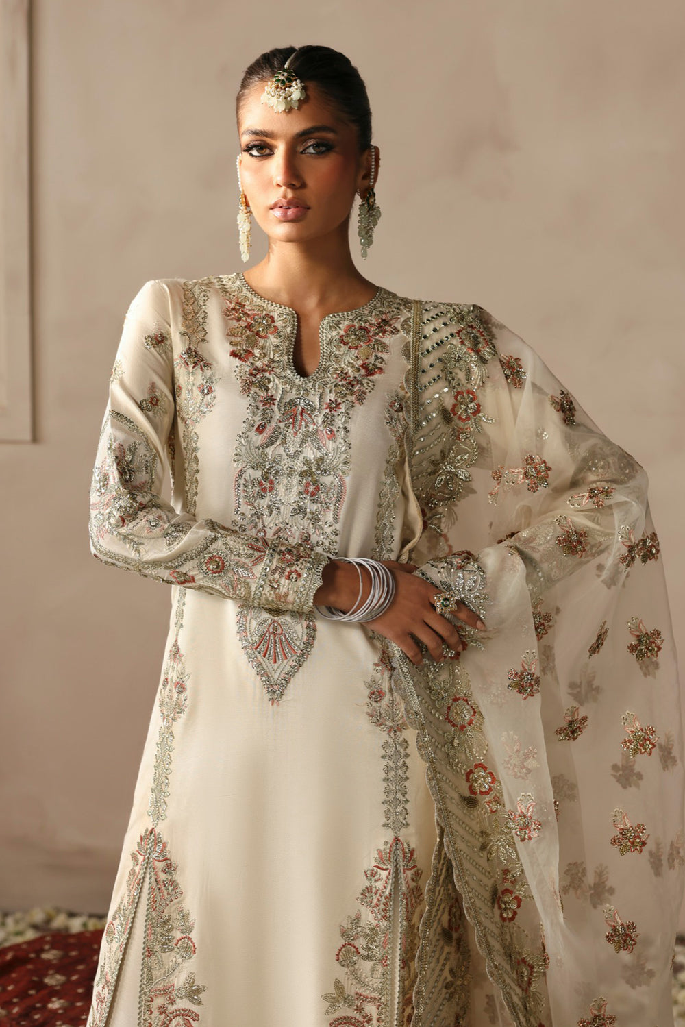 This luxurious outfit features a raw silk base paired with a sheer organza dupatta adorned with intricate embroidery on all four sides. The shirt showcases a timeless design with left and right panels embellished in golden panni, light gold tilla work, and delicate sequins, creating a dazzling interplay of textures. The back of the shirt is adorned with artistic motifs, while the embroidered sleeves and mihrab-inspired border add a touch of traditional charm. Completing the look is a pair of plain trousers, offering a minimalistic balance to the ornate ensemble.