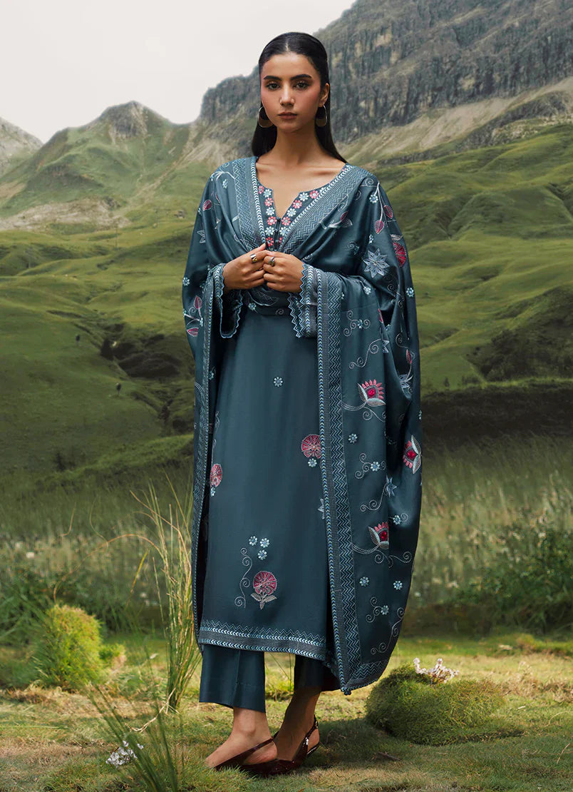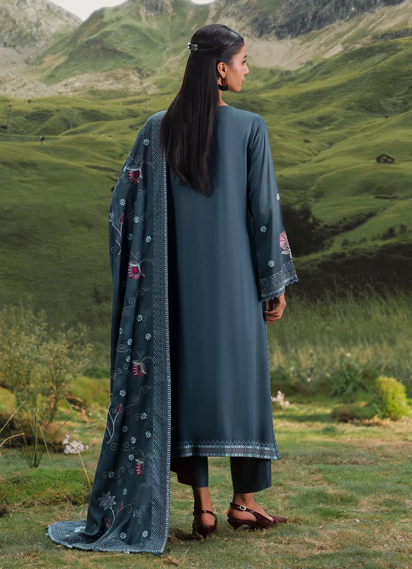 Azra in Grey Blue from our Winterkari '25 Collection. An embroidered twill viscose 3pc unstitched outfit.