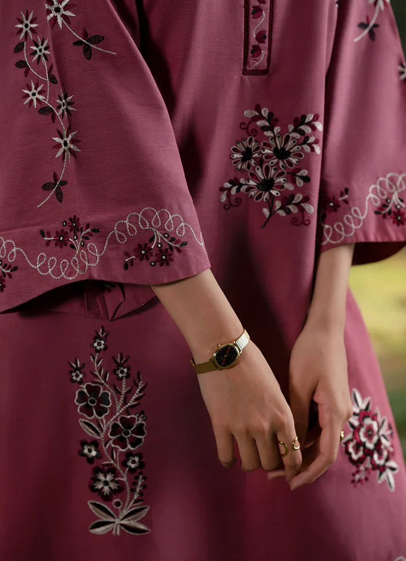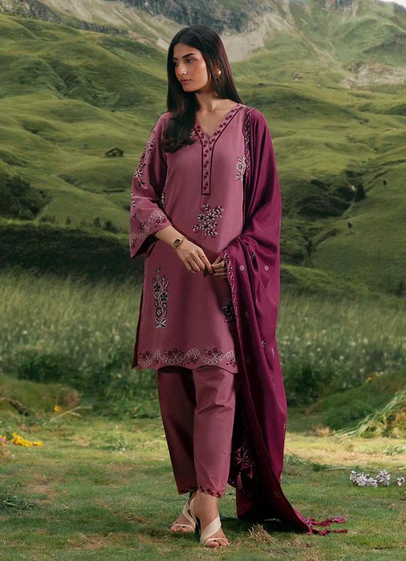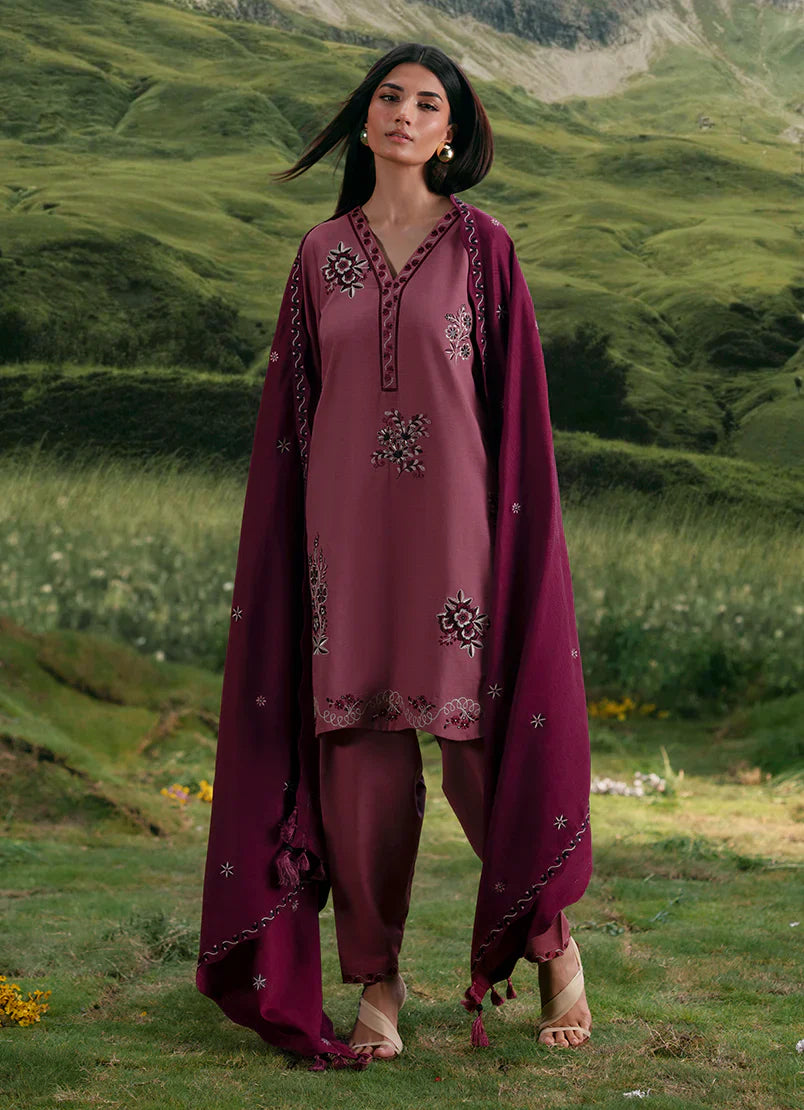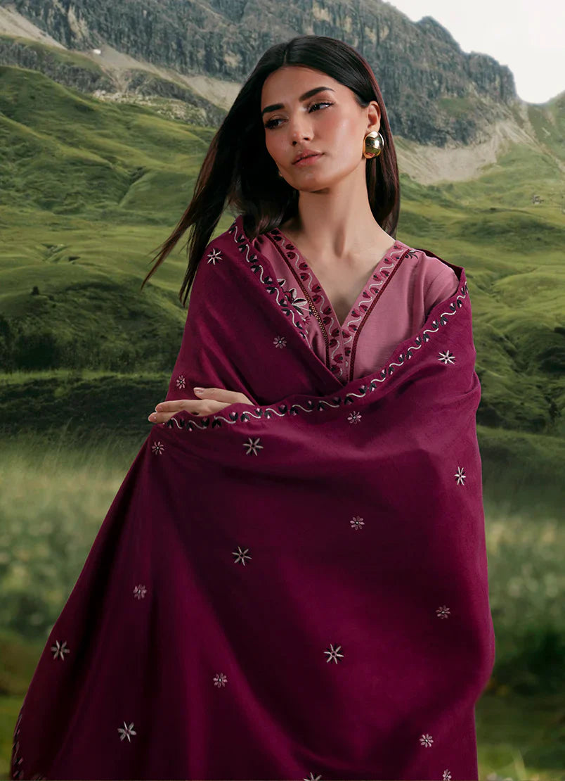 Leyan in Garnet Pink/Crimson from our Winterkari '25 Collection. An embroidered khaddar 3pc unstitched outfit paired with khaddar trousers & an acrylic shawl.