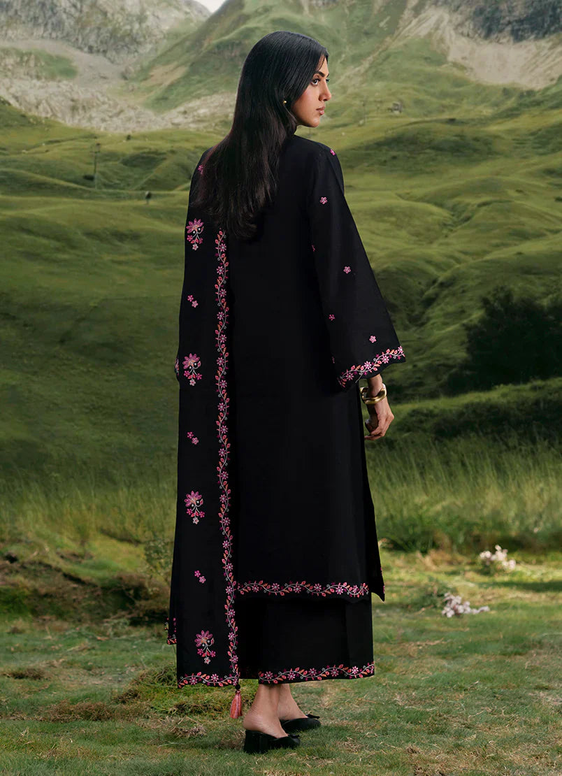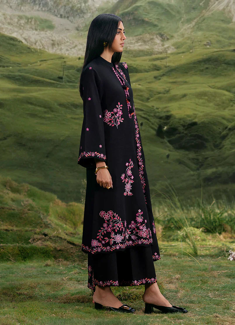 Nilofar in Black from our Winterkari '25 Collection. An embroidered khaddar 3pc unstitched outfit paired with khaddar trousers & an acrylic shawl.