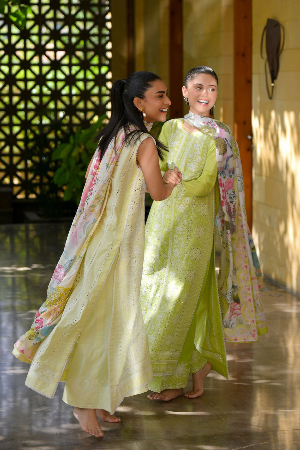 Radiate subtle elegance in this Pastel Green ensemble. The highlight is a beautiful silk dupatta with a delicate lace trim, featuring a captivating animation that adds a touch of ethereal charm. The shirt is crafted with intricate white-tone Schiffli embroidery and boasts a refined lace neckline. Adding to the detailed design is an embroidered back shirt and coordinating embroidered izaar trousers, creating a cohesive and gracefully detailed look in a soft, summery hue.
