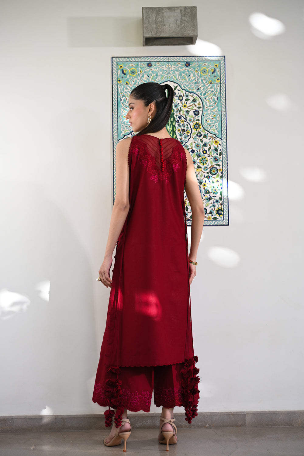 Introducing a vision of rich detail and sophisticated design in this stunning maroon article. This exquisite ensemble features a fully embroidered shirt with an elegant scalloped hem. The matching scalloped izaar trousers continue this theme of refined detail. Completing the look is a beautifully embroidered scalloped slub silk dupatta, finished with a delicate lace trim. As a thoughtful finishing touch, charming tassels adorn the armholes of the shirt, adding a unique and stylish element to this deeply hued and meticulously designed outfit.