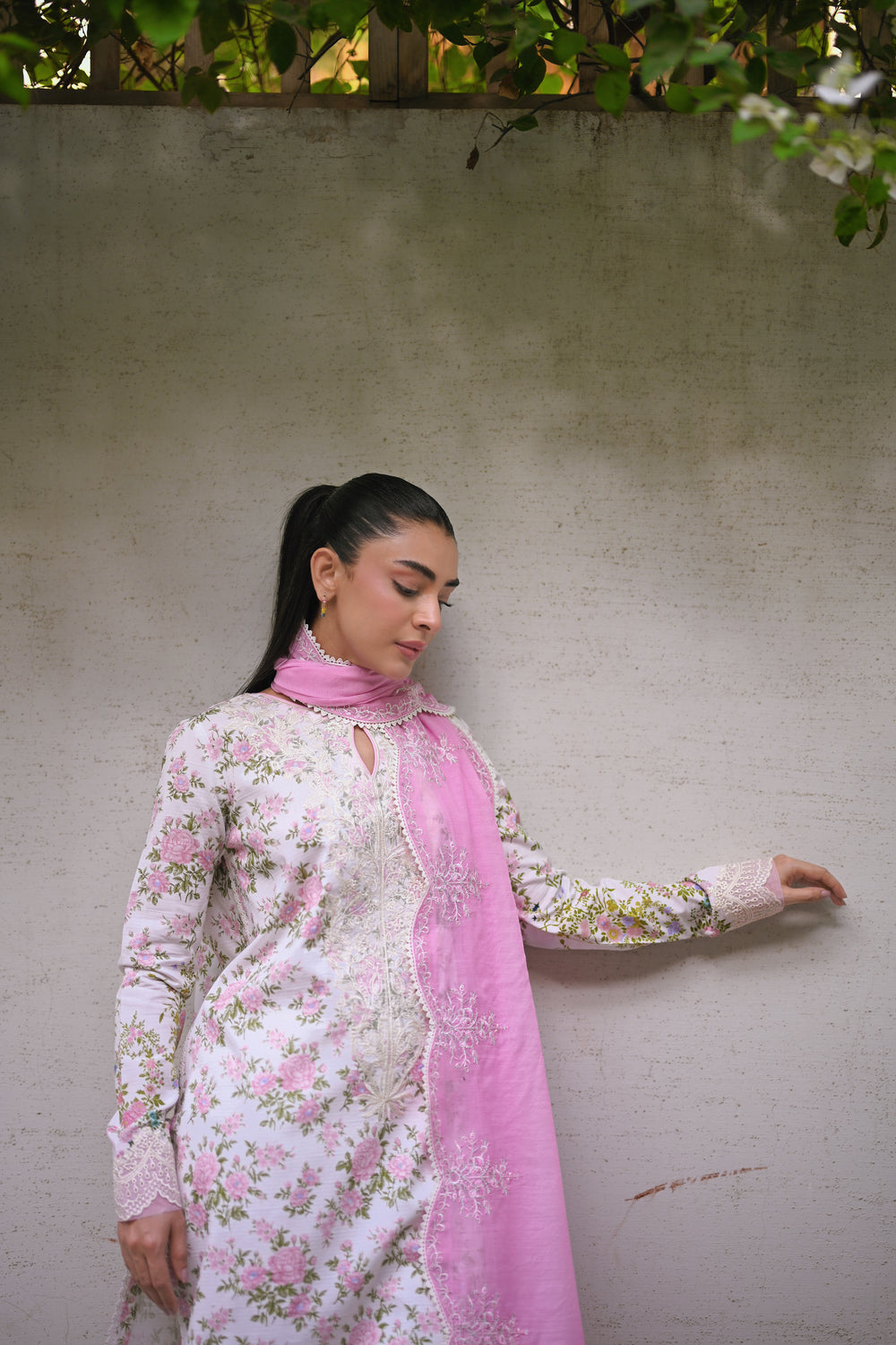 Elevate your style with our exquisite printed embroidered floral shirt, featuring a stunning teasel embroidered neckline and delicate embroidery on the sleeves and hem, enhanced with elegant organza details. The look is completed with a beautifully scalloped trouser and a contrasting blush pink dupatta, adorned with four-sided heavy scalloped lace, adding a touch of timeless grace to your ensemble. Perfect for any occasion where sophistication is a must.