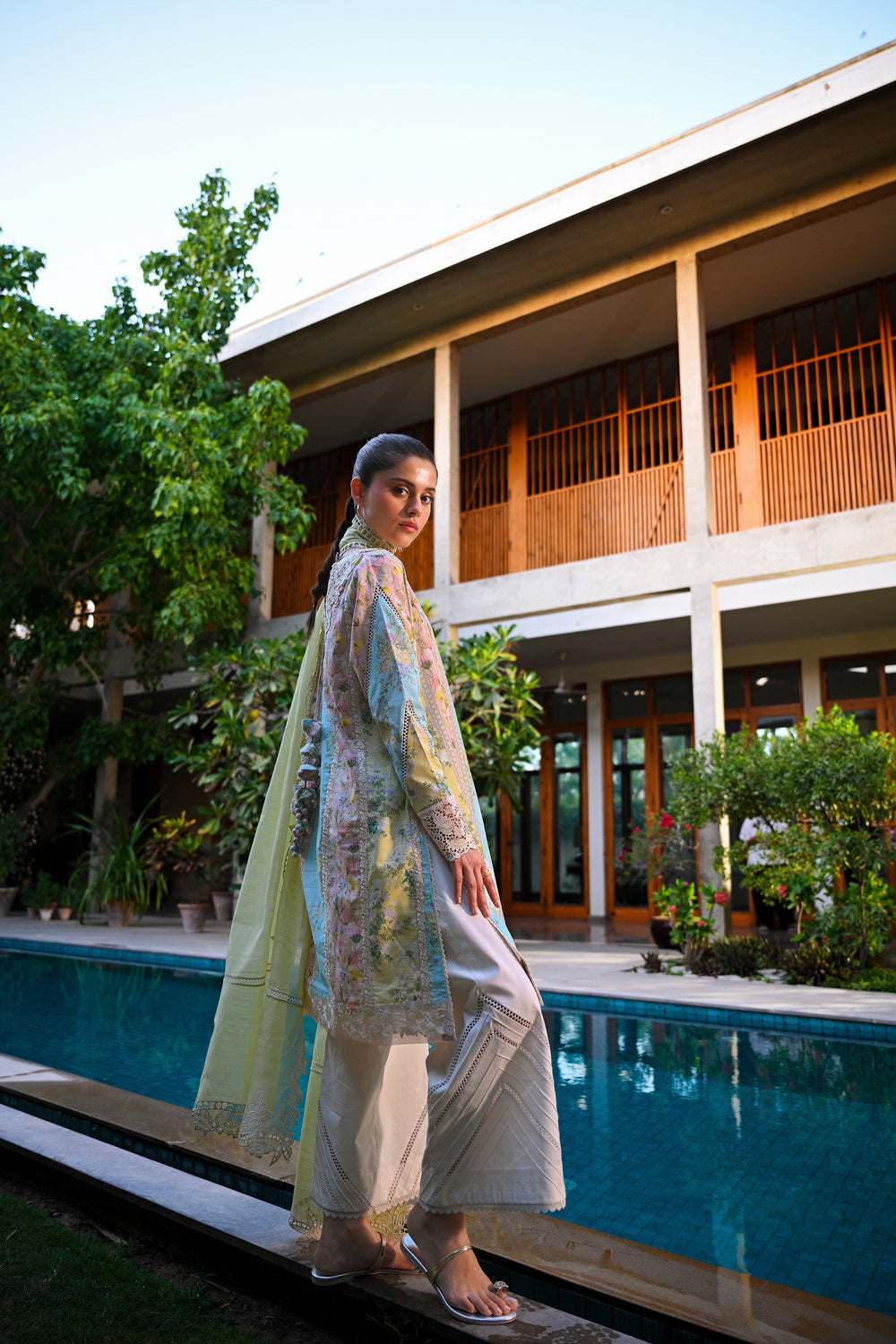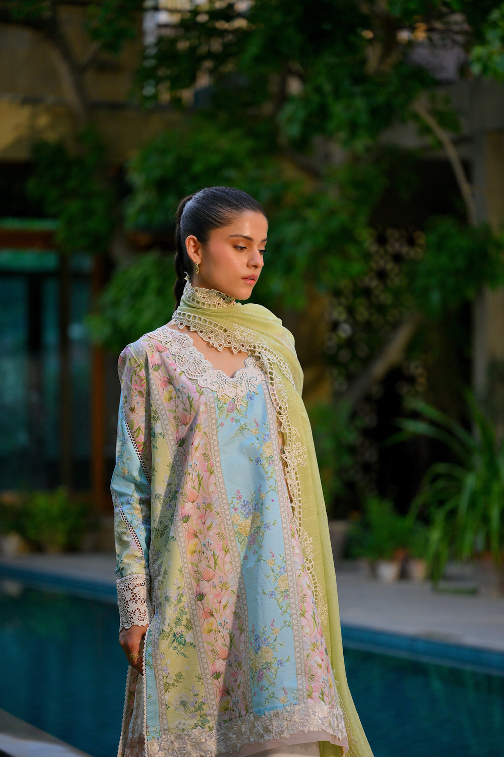 Exude grace in this elegant pistachio ensemble, featuring a beautifully embroidered shirt with a charming schiffli neckline and delicate embroidery on the back, enhanced with dainty tassels. Schiffli-detailed sleeves and lace accents add feminine flair, while the shirt is elevated by two embroidered panels and an organza-enhanced hem patch. The izaar pants are richly adorned with intricate lace work for a sophisticated finish. A slub silk dupatta in a soft pistachio hue completes the outfit, highlighted with exquisite four-sided schiffli cutwork embroidery and lace, bringing a perfect blend of tradition and refinement.