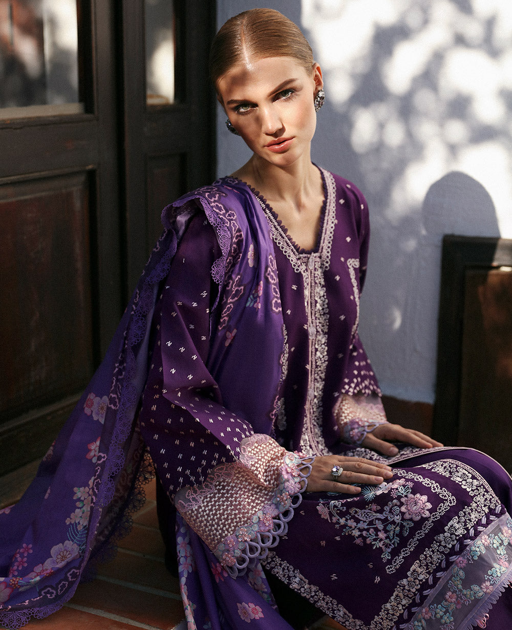 Cemile's purple hue is elegantly crafted with delicate Chinese embroidery, creating a harmonious blend of lilacs, pinks, whites, and greys. The geometric structure and richly dyed lawn fabric are enhanced by a voile printed dupatta, making this piece a regal choice.