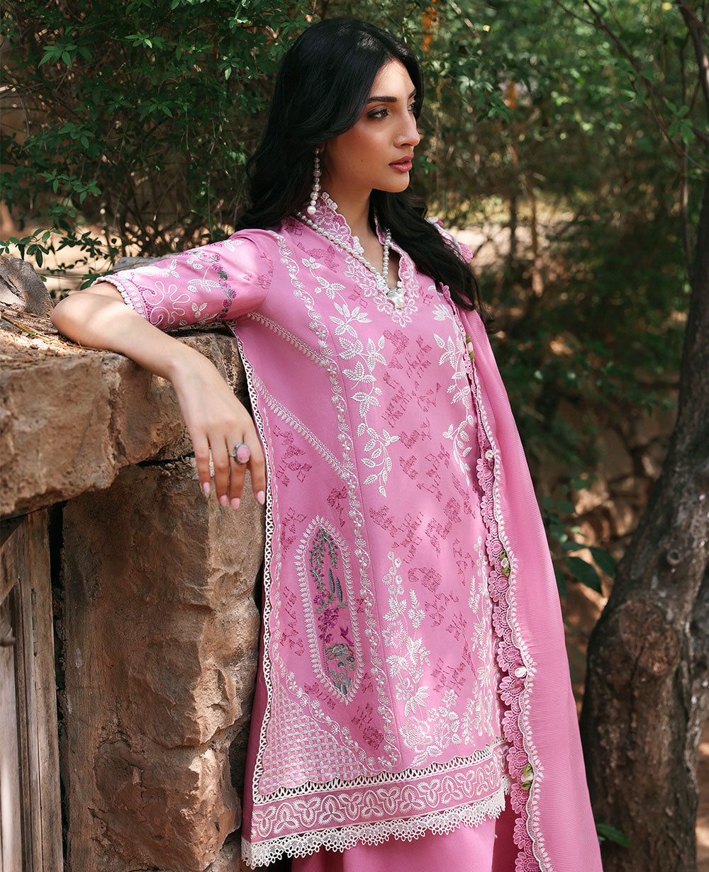Radiating timeless charm, this three-paneled shirt features white satin-embossed floral stitches in a refined mono-textured finish, complemented by a V neckline adorned with delicate floral detailing. Shikargah-inspired motif grace the side panels, adding depth and tradition to the design. The look is elevated with a rocket net dupatta, finished with a scalloped four-sided border for an elegant touch. This ensemble seamlessly merges classic craftsmanship with modern flair, making it a standout expression of grace and sophistication.