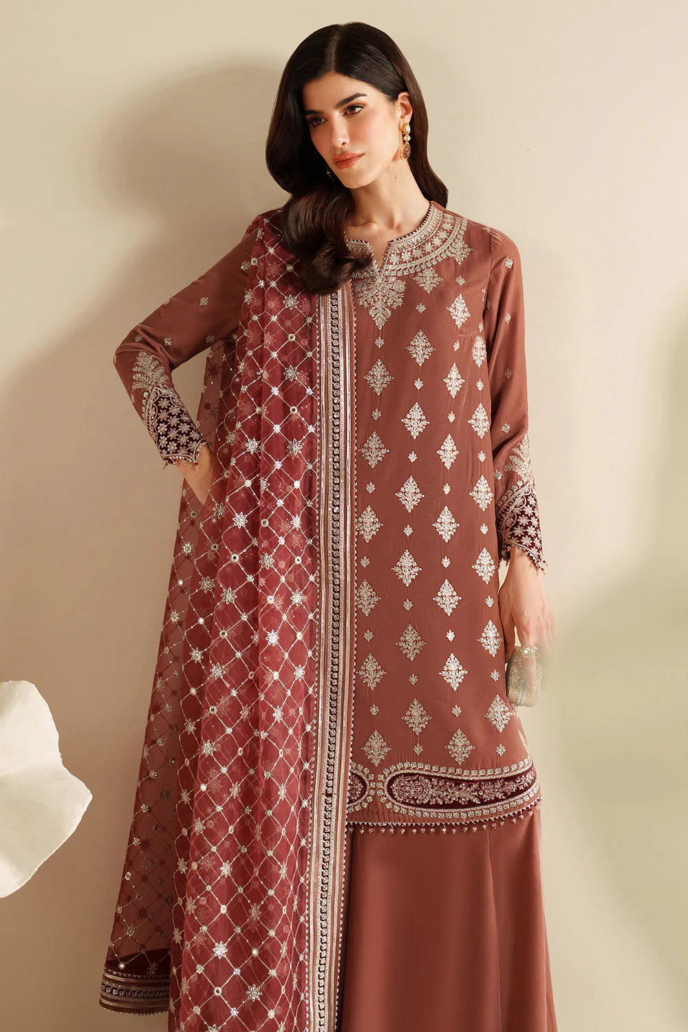 Crafted with rich pure velvet, this formal ensemble features intricate embroidery on the front, sleeves, and sleeve borders, showcasing refined craftsmanship. The dyed velvet back and bottom provide a cohesive, luxurious texture, while the embroidered organza dupatta and its velvet borders add an elegant, delicate touch. Perfect for formal occasions, this outfit blends sophistication with comfort through premium fabrics and detailed embellishments.