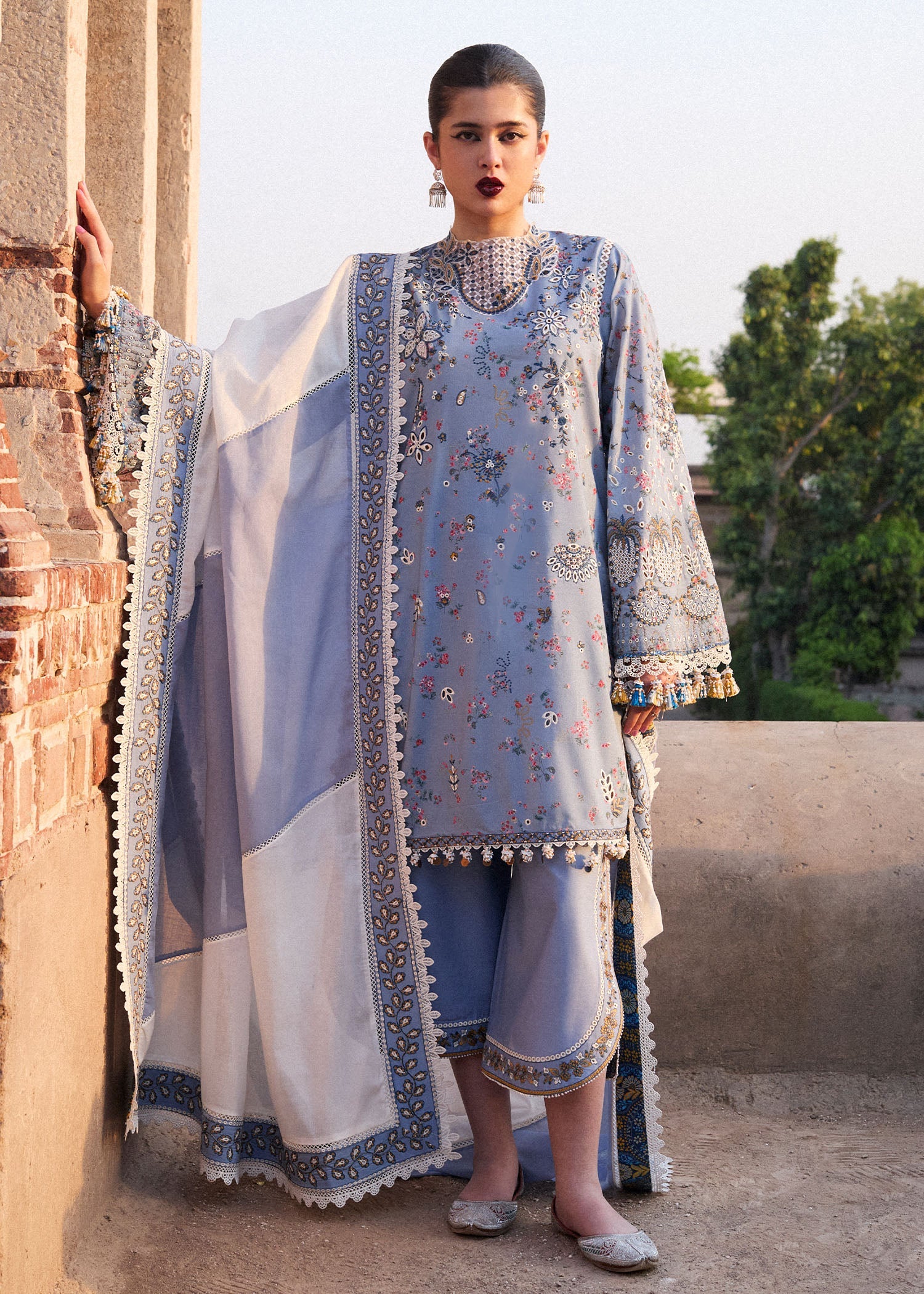 An ice blue printed shirt ensemble crafts a picturesque view of trendy modernity, infused with skillfully executed embroidery on the finest lawn fabric. Modern embroidery stitches add detailed accents. Alluring modern elements are combined with intricate embroidery in hues of ivory, blue, and mustard, creating an ethereal aesthetic. The design features an embroidered neck patch and modern sleeves with borring technique throughout the shirt, lending a contemporary effect. A color-blocked dupatta, paired with matching cotton trousers featuring embroidery, completes this dazzling and modern silhouette.