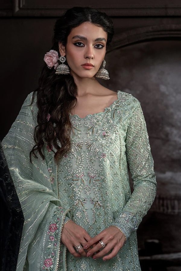 Haniya, an exquisite mint green outfit that embodies grace and allure, is a true masterpiece in the realm of fashion. Crafted with utmost care and attention to detail, this enchanting ensemble will captivate hearts with its embroidered sequins and hand-embellished neckline. The interplay of embroidery and sequins creates a harmonious symphony of texture and luster, showcasing the mastery of the artisans behind Haniya