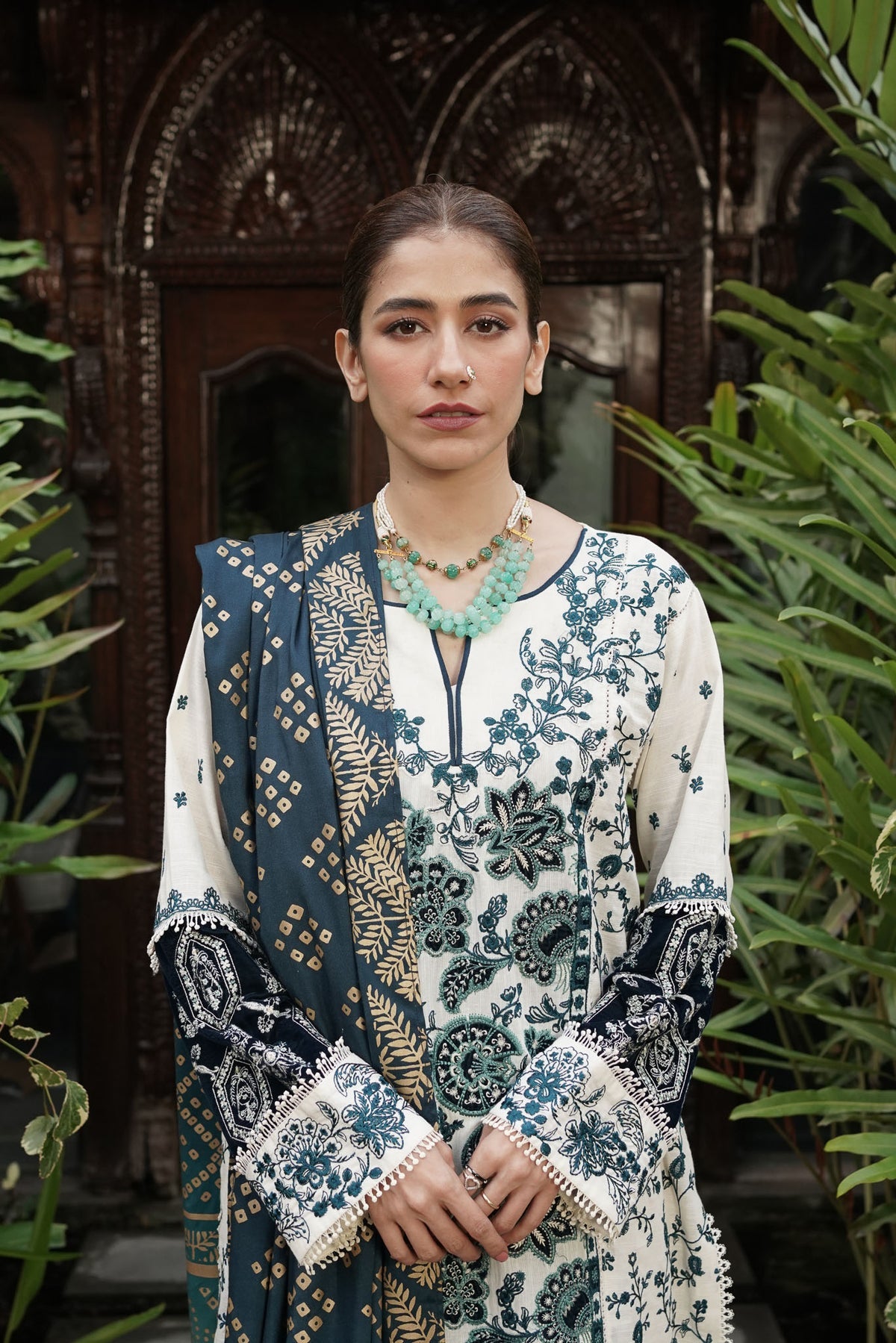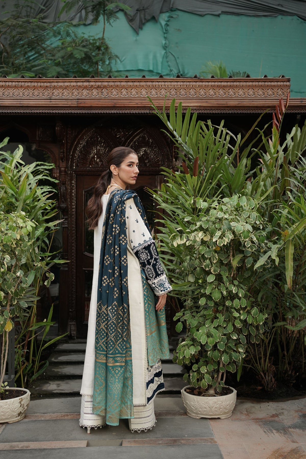 This Khaddar off-white outfit with accents of blue and marine is adorned with exquisite laser velvet applique embroidery. The digital gradient shawl with antique gold chunri print makes it a perfect choice for winter festivities.