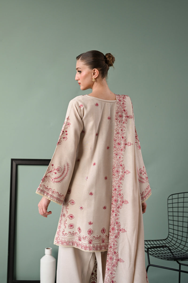 Introducing a celestial ivory canvas, adorned with breathtaking embroidery in deep maroon and off- white hues. The delicate blooms and intricate patterns form a captivating tapestry. Foil work on the neckline and shawl enhances the ensemble’s allure, allowing the embroidery to truly shine. Paired with a matching embroidered shawl and wide-hem shalwar, this design embodies understated beauty with a celestial charm, perfect for those seeking an ethereal yet sophisticated look.