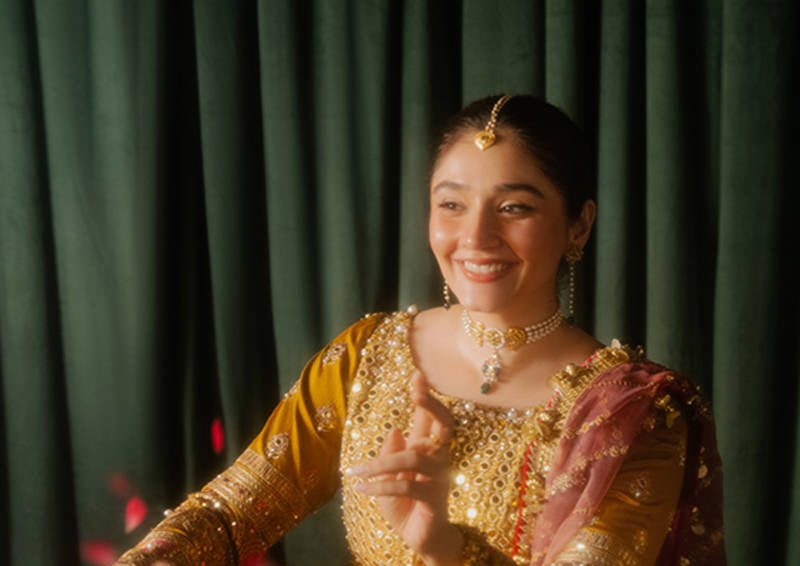 Enter the world of "Meher" from MNR’s Dur-e-Nayab 2024 collection. This mustard lehenga choli, crafted from rich Indian silk, showcases intricate thread and tilla embroidery, sequin work, and hand-applied pearls that shimmer with every movement. Pale pink satin silk patches on the lehenga create a striking contrast, while a three-toned pink organza dupatta with a chevron pattern and a delicate border adds an elegant touch.