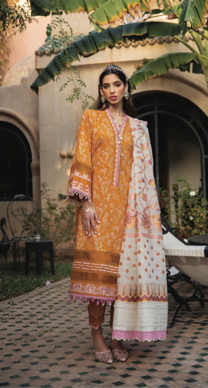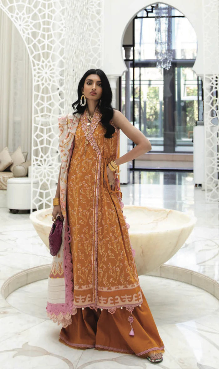 Menara Mustard emulates soft kaantha embroidery in dainty florals that bloom all over the shirt. Further uplifted by unmissable pre-appliqued borders. The gorgeous exclusively woven jacquard dupatta will be a keepsake for years to come, magically matching with a myriad of other outfits!!