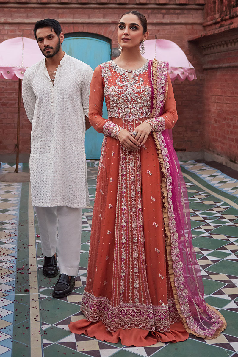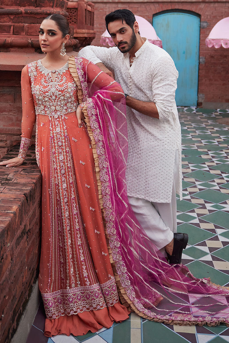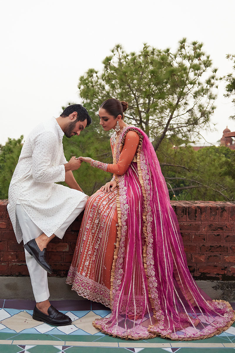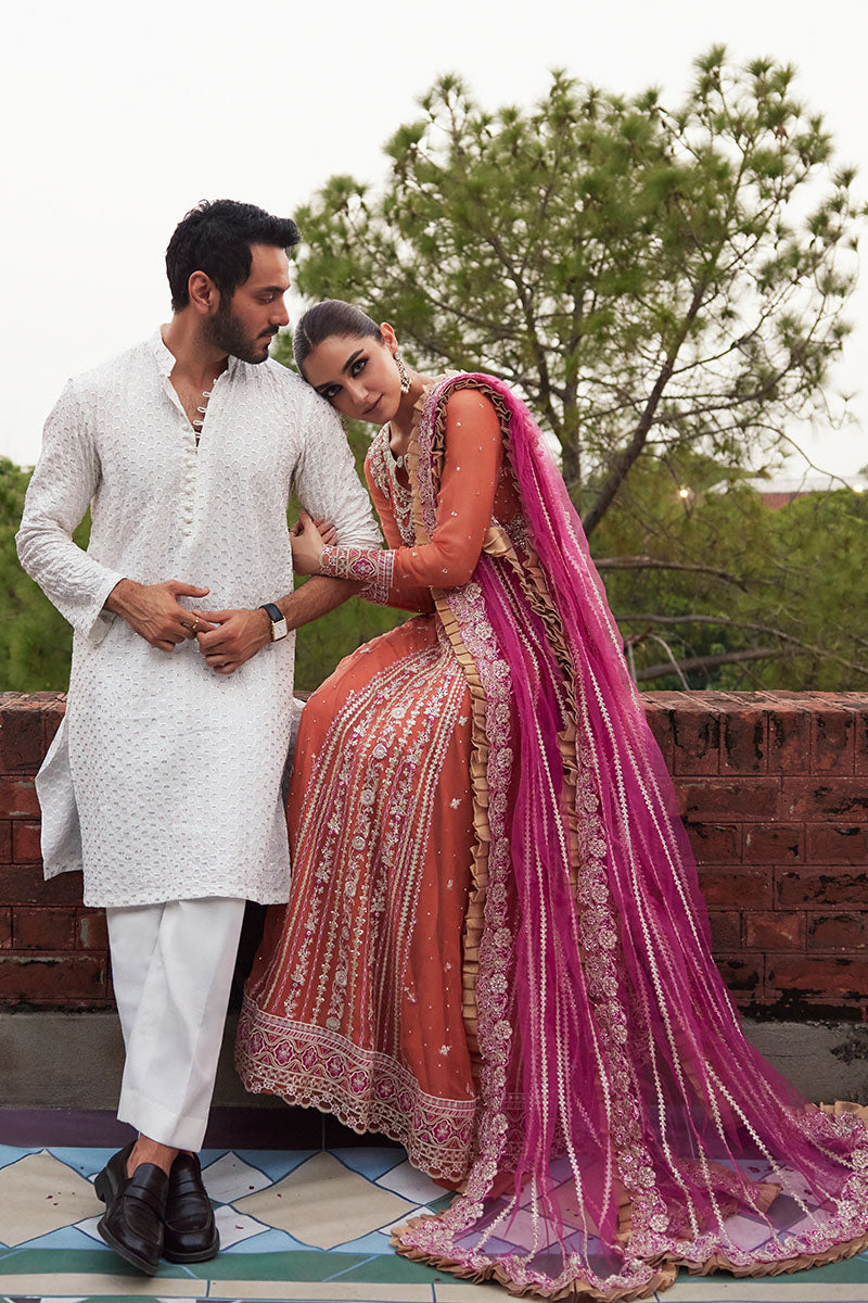 Adorned with meticulous hand embellishments and intricate embroidery on a chiffon canvas, our outfit Nameera is a testament to the craftsmanship that defines elegance. The radiant burnt orange and dupatta in soft pink shades intertwine, infusing the ensemble with a sense of vibrancy and grace. The look is complete with a hand embellished tassle, hand embellished neckline ball and an embroidered and sequined net dupatta.