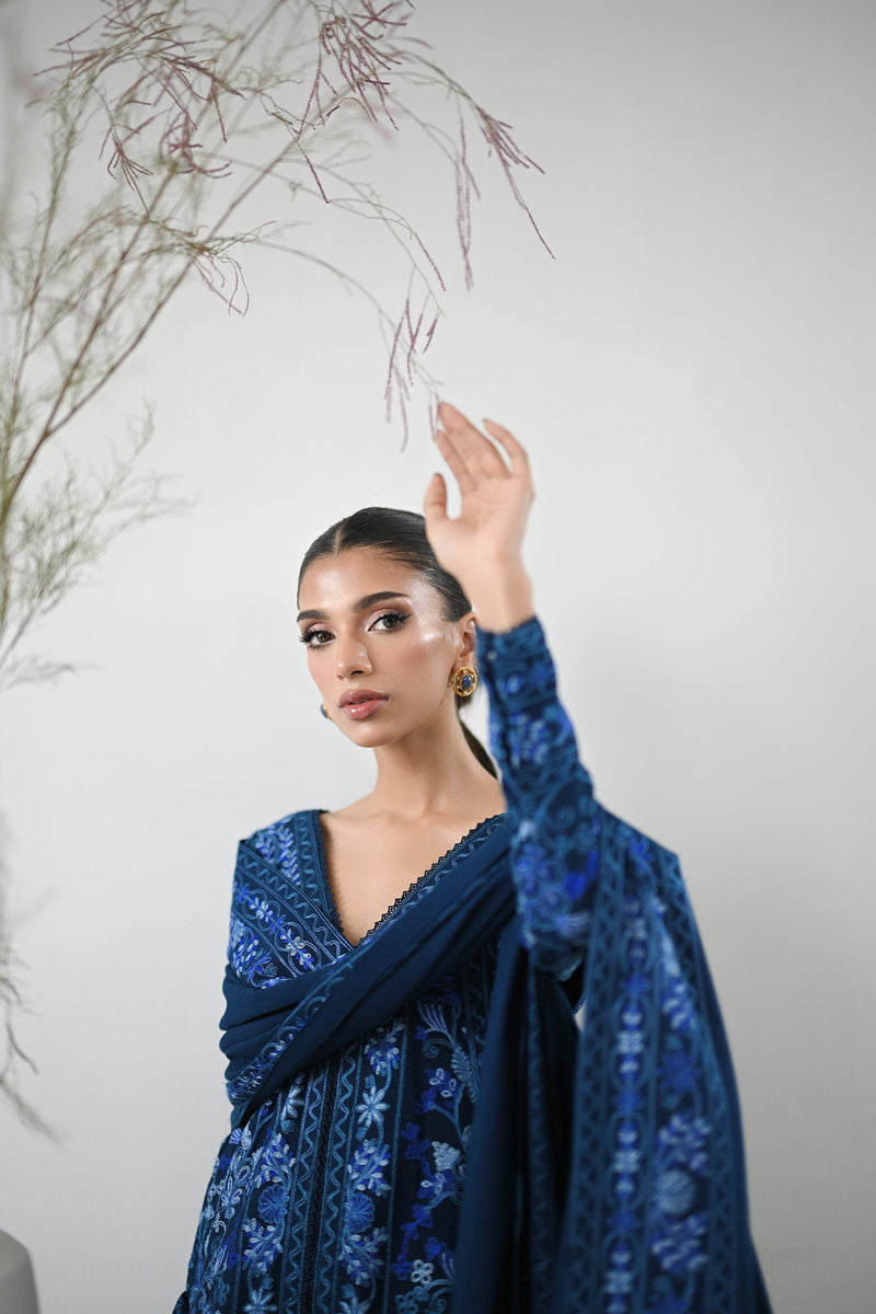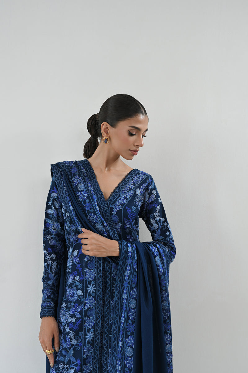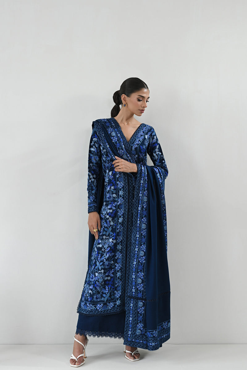 Crafted with meticulous care, deep navy blue open-front shirt is adorned with intricate aari embroidery, showcasing lush floral motifs in shades of sky blue, navy, and soft blues. Paired with elegantly tailored izaar pants and complemented by an exquisite embroidered shawl, this ensemble perfectly captures the beauty of winter fashion with a sophisticated and graceful flair.