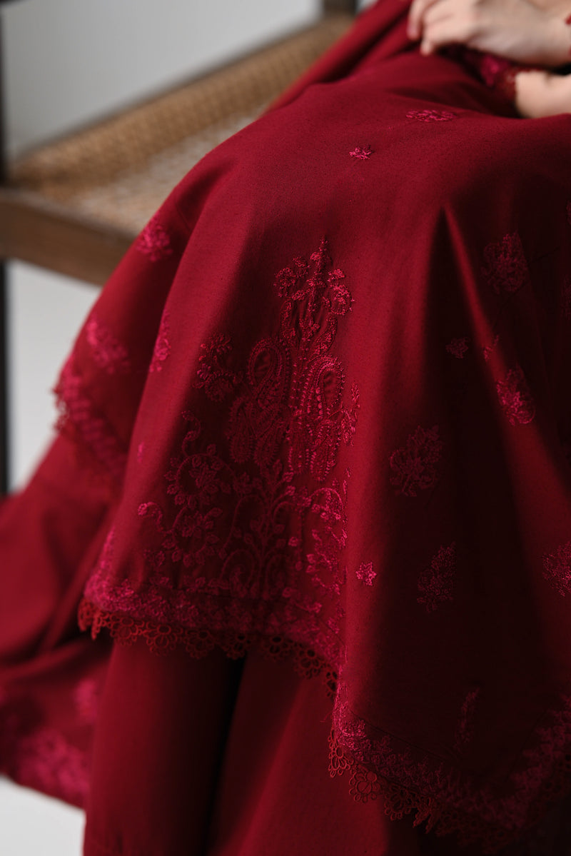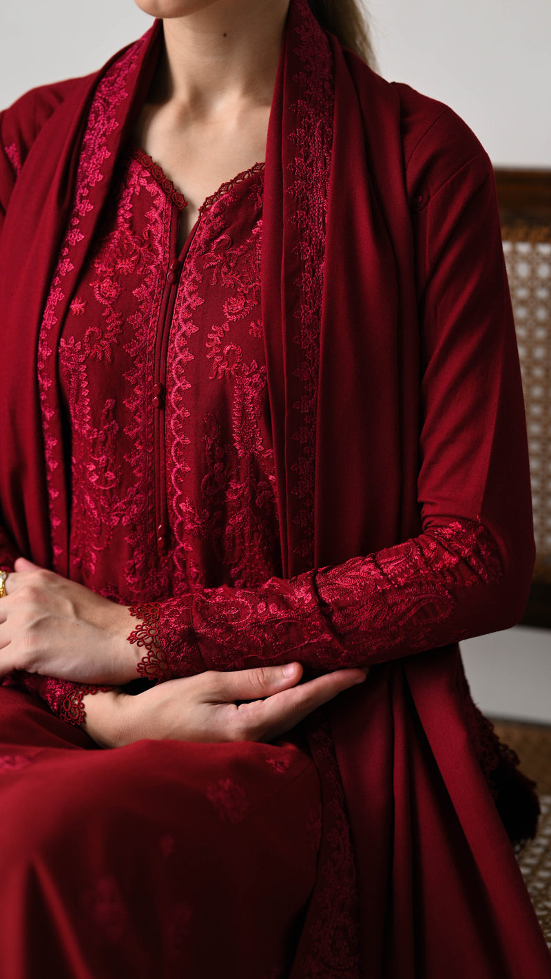 This elegant deep maroon outfit showcases intricate embroidery in delicate shades of pink, forming beautiful floral patterns across the fabric. The embroidered neckline adds a refined touch to the classic design. Paired with wide-leg trousers and a luxurious karandi shawl, this ensemble is the epitome of graceful sophistication, perfect for making a statement this winter season.