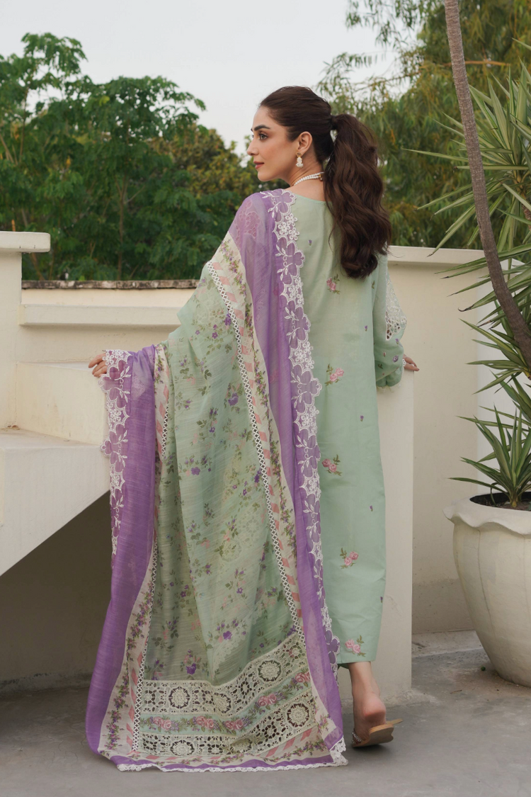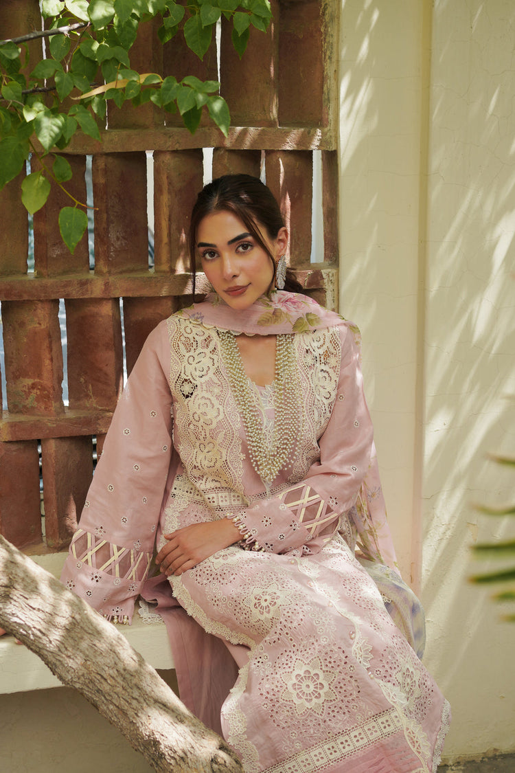 Rozay, a captivating ensemble, exhibits the dusty pink kameez crafted with beautiful cutwork detailied lace on the shirt yoke. Its lower panel dazzles with schiffli cutwork embroidery and coordinating lace patches, accented by three distinct lace inserts for a harmonious fusion of style. Delicate schiffli cutwork sleeves add a refined touch, while plain pants and a digitally printed dupatta complete this exquisite outfit.