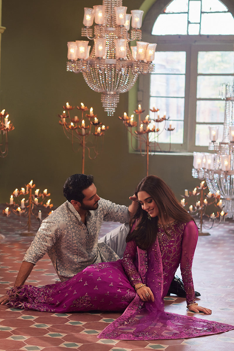Introducing our exquisite statement look, Shehrzaad a stunning embodiment of refined luxury and artistic craftsmanship in a mesmerizing shade of magenta. Crafted on sumptuous chiffon fabric, the outfit boasts intricate hand embellishments and meticulous embroidery that forms an enchanting symphony of design. The delicate details dance across the flared pishwas and embroidered net dupatta, evoking a sense of timeless allure and sophistication.