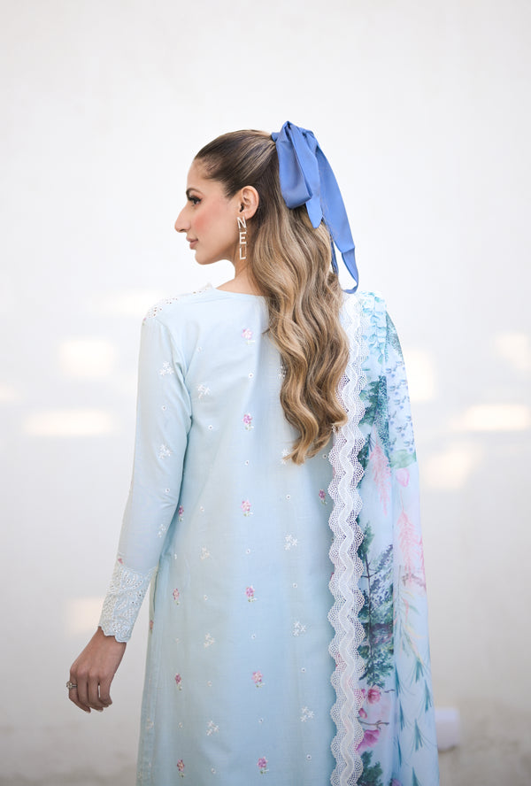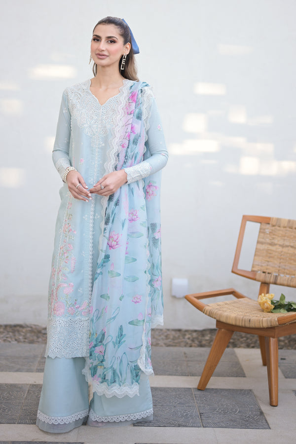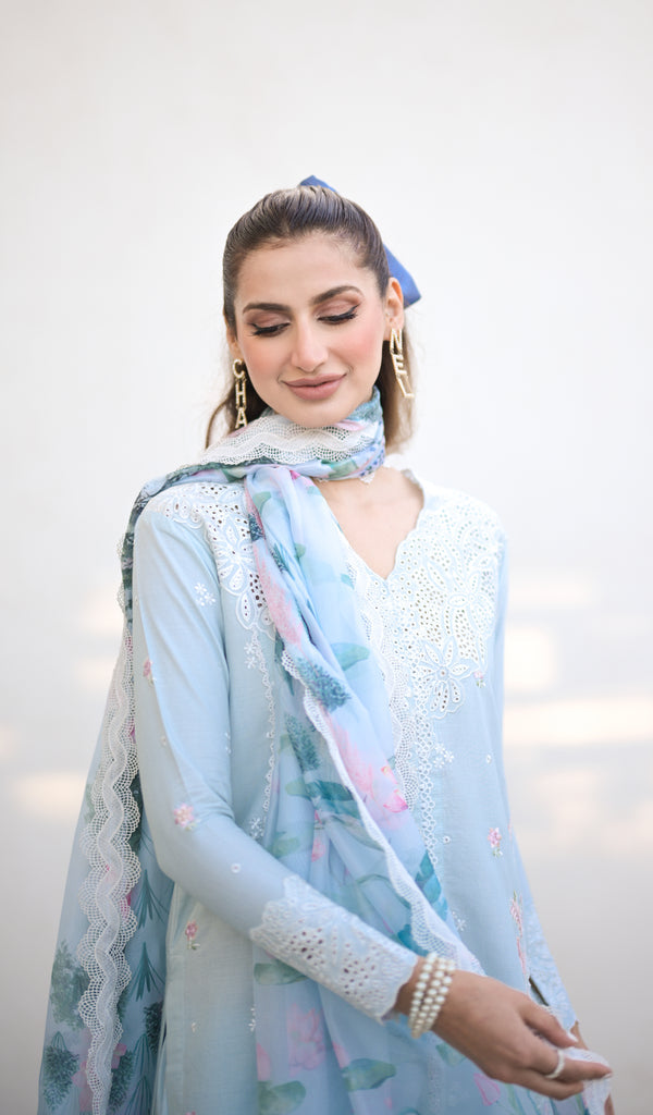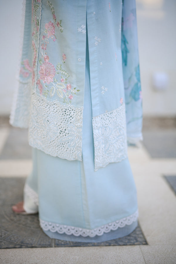 Mesmerizing Ice Blue NEL-24604 adorned with delicate floral embroidery. With hues of peach, pink, blush pink, pastel green, and white, each stitch tells a story of elegance and grace. The neckline and hem patches stand as a symbol of refined style. Paired with matching plain trousers and a perfect printed silk dupatta, enhanced with the enchanting motif of water lilies.