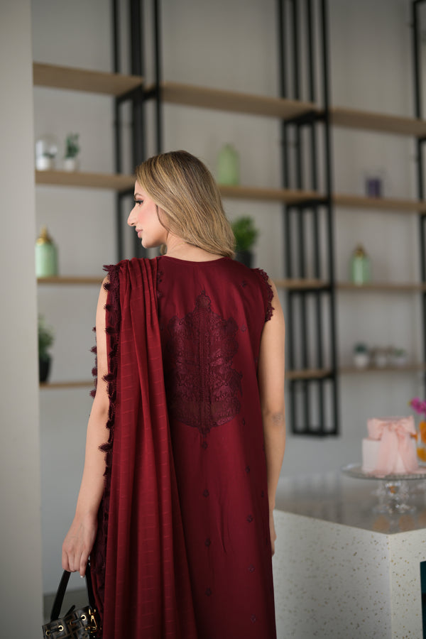This ensemble steals the spotlight with its intricate embroidery, featuring a mesmerizing Acanthas floral pattern inspired by the Mollies. While the trouser opening is delicately adorned with matching motifs. And to complete the ensemble, the matching slub dupatta, adds a graceful layer of elegance.