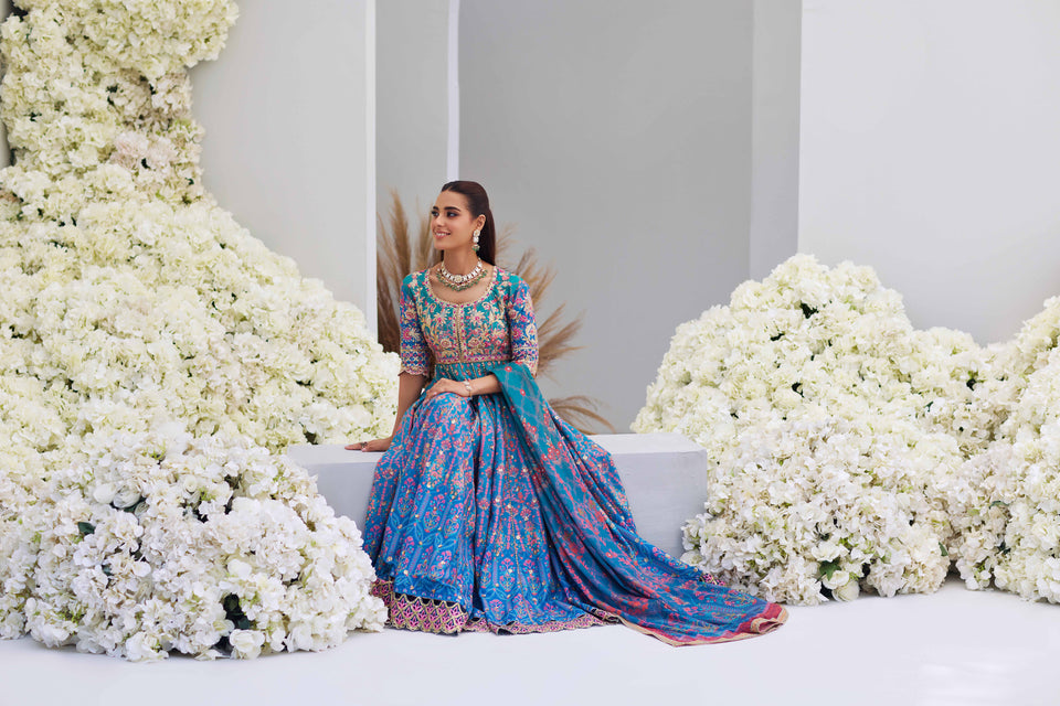 Radiate in this subtle sea green and blue signature printed pishwaas. The bodice of the pishwaas features gold floral embroidery over Mina Hasan's signature print, with a ombre effect starting right under the bodice with slight chhan on the pishwaas. The outfit is completed with a matching printed dupatta and pants. Fabric for full sleeve is provided in the box.